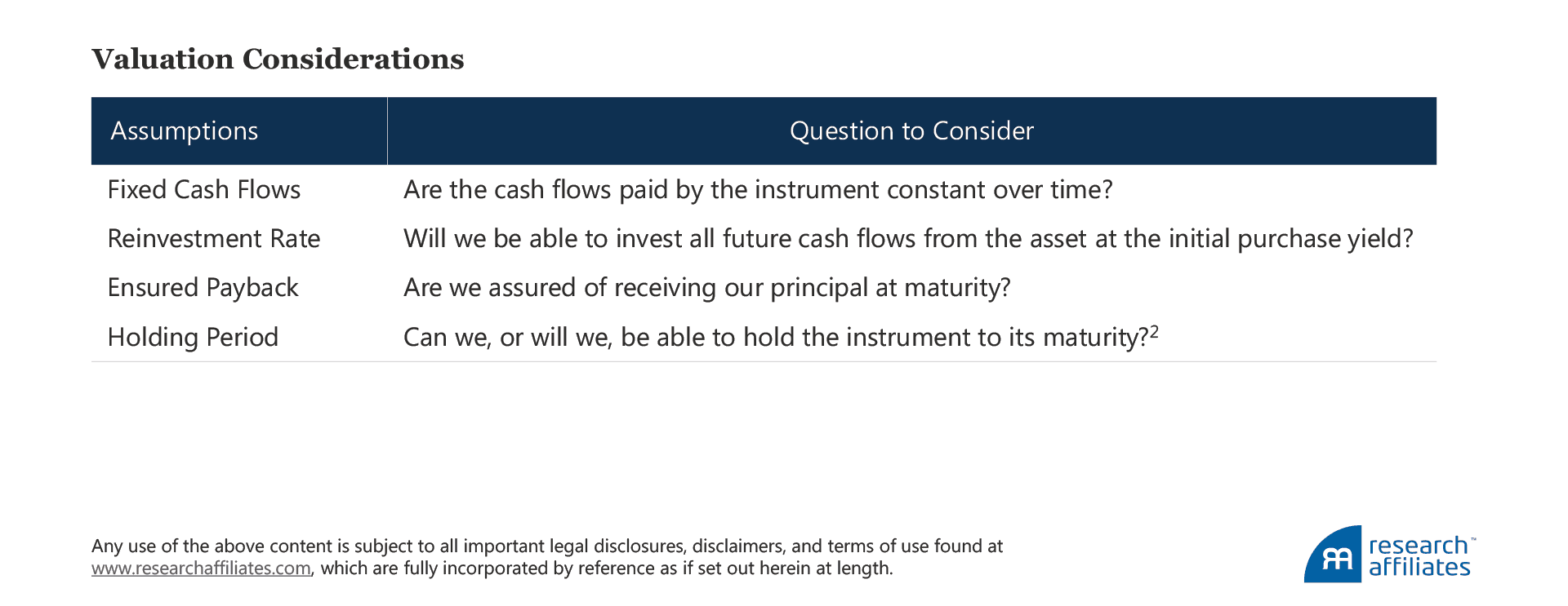 Starting from the perspective of purchase yield has the benefit of certainty. When we buy an asset we know its yield without the need for fancy models. We can simply look it up! This simple valuation framework can serve as a useful approach in understanding core assumptions required to develop expected returns across a breadth of investment assets. If the answer to all of the following questions is “yes,” we know with certainty that the future return of the instrument is its yield today. We can then think of expected return as how far from these initial assumptions we need to move based on the asset in question.