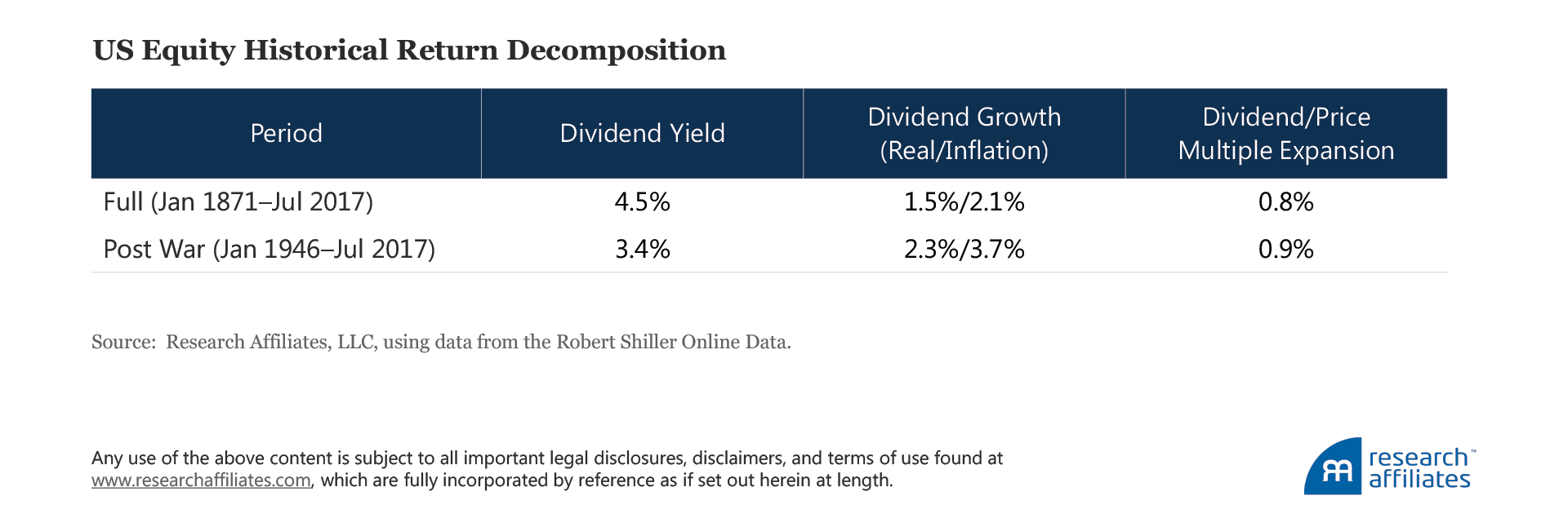 So, although dividend yields are a good starting point for deriving forward-looking estimates, we also need to consider other potentially meaningful sources of return. Through a simple decomposition of stock returns over the last two centuries, we can identify three reliable components to forecast and model (Arnott and Bernstein, 2002). In short, depending on the time span, nearly one-third to one-half of the long-term return on stocks comes from sources other than dividend yield, such as inflation, growth in dividends, and changes in valuation levels. We are able to extend this framework beyond US stocks to any asset class which relaxes the constraints in a similar way.
