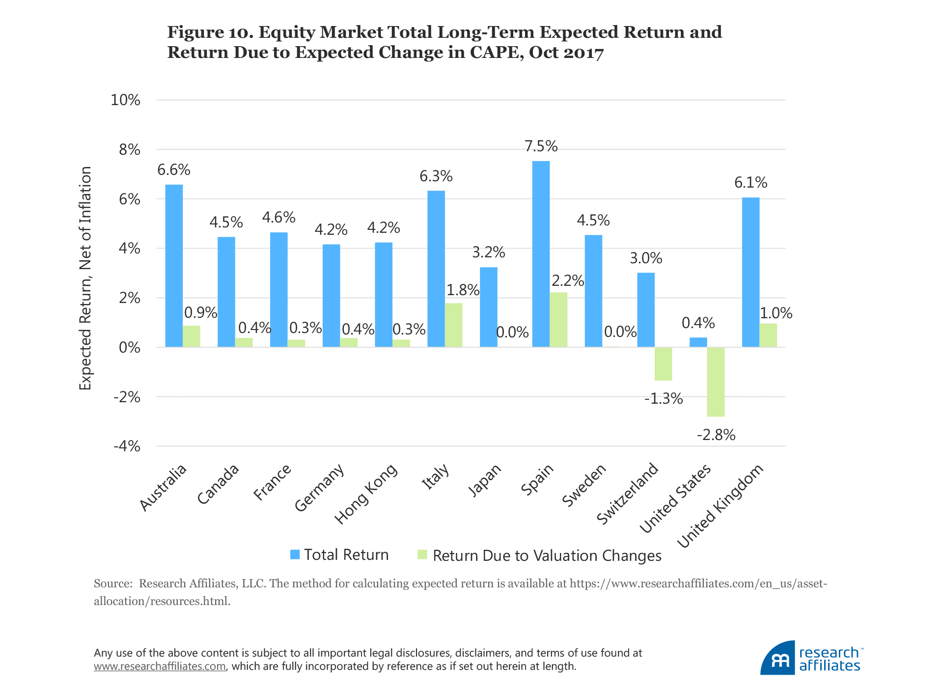 16. This is based on our publicly available equity valuation methodology, which compares CAPE to a target value half way between the current value and the long-term average. More detail is available at https://www.researchaffiliates.com/content/dam/ra/documents/asset-allocation/aa-methodology-822.pdf.