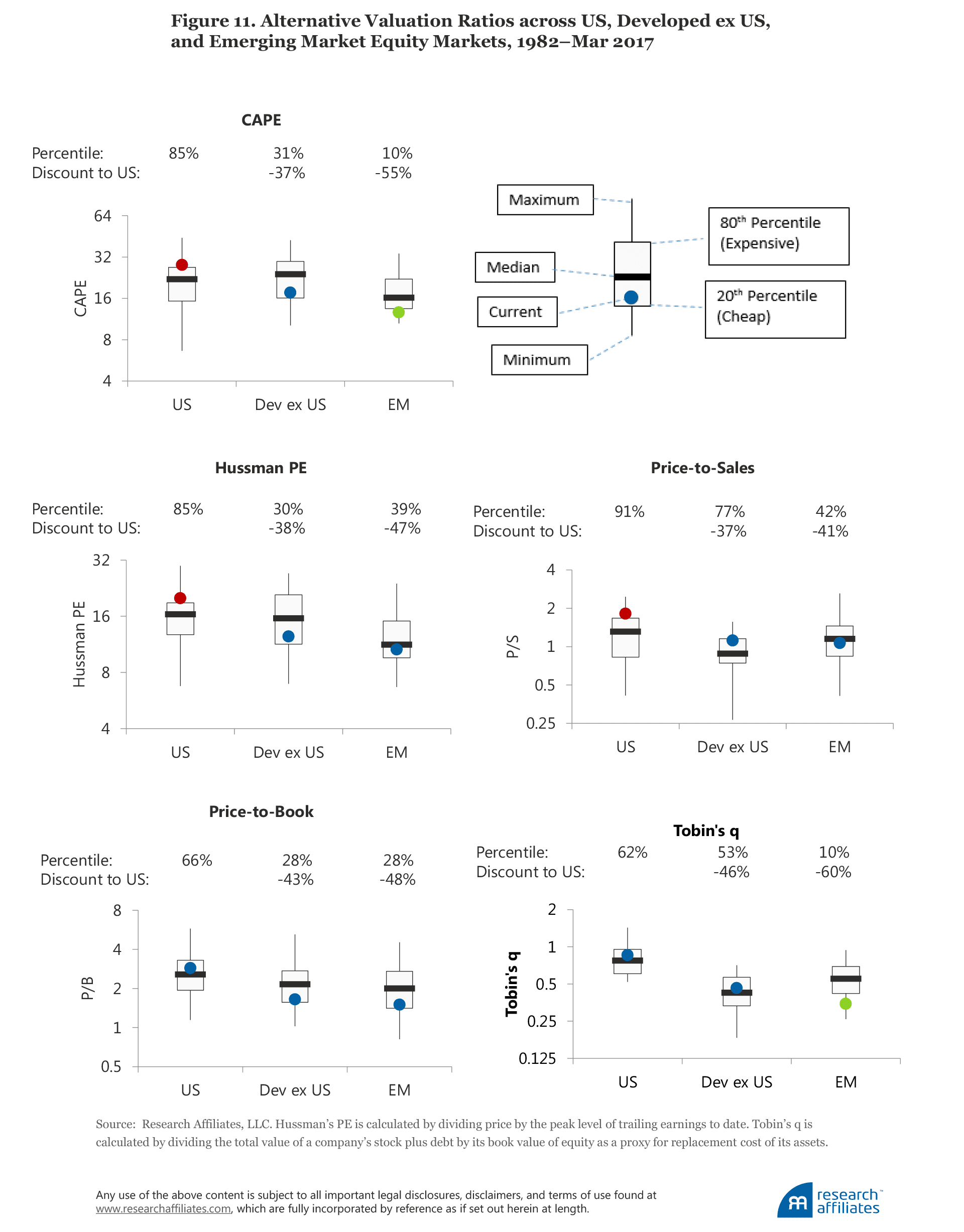 Finally, these same arguments in favor of a high CAPE would also justify high multiples in many other countries, and yet when we examine valuation ratios—CAPE ratios and others—in non-US developed and emerging markets, we find most non-US markets are far less expensive than the US stock market based on almost any measure we use, and more important, the spread has rarely been wider. Investors ignore the warnings of high US CAPE ratios at their peril.