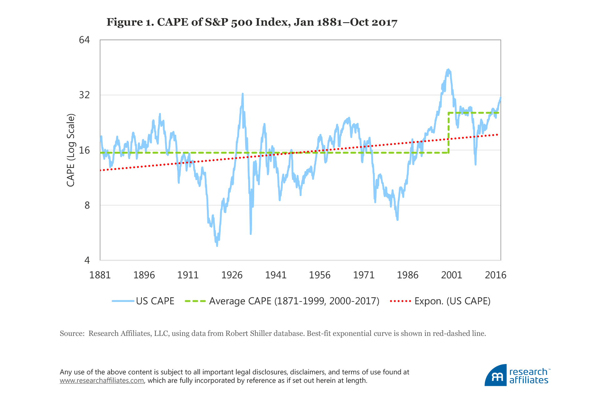 We believe the correct answer is far more nuanced than a simple “yes.” Most of us who use CAPE as a valuation tool readily accept that CAPE is only one measure of valuation, and that—as American investor Stan Druckenmuller likes to point out—capital flows drive short-term market behavior far more powerfully than valuation. Going back to the early 1990s, one of us (Arnott) has always preferred to show historical CAPE as an upward-sloping best-fit line (the red dashed line in Figure 1) in tacit acknowledgment that its equilibrium1 level is not static, and that it should rise as the US market matures and becomes more efficient. Let’s not forget that in 1881 the United States was an emerging market by modern standards!