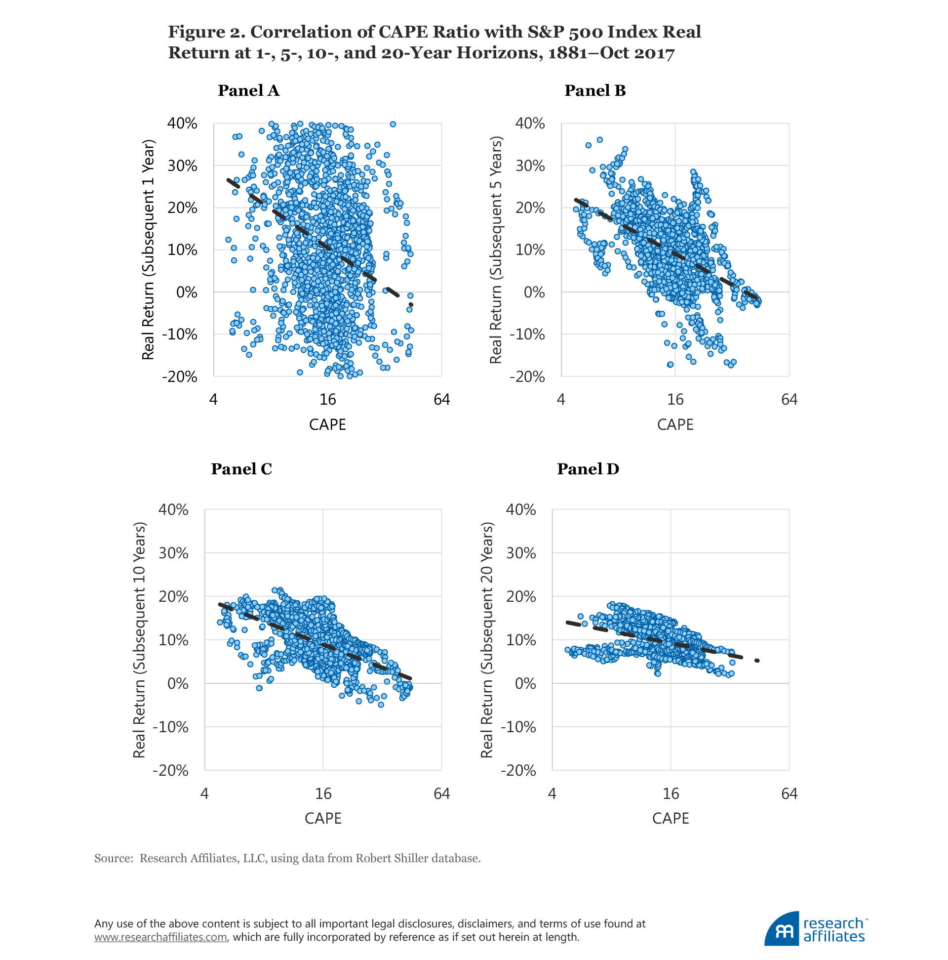 But first, let’s examine CAPE’s efficacy in the US market over horizons of 1 to 20 years. In Figure 2 we compare the starting CAPE ratio with the S&P 500 Index return at each 1-, 5-, 10-, and 20-year horizon beginning in 1881 through October 2017.2 The scatter plot in Panel A illustrates that the CAPE ratio does forecast return, even on a short horizon of 1 year, although the forecast has considerable uncertainty.3 Indeed, if the regression line wasn’t shown in Panel A, it would be difficult to discern any relationship at all. Although the short-term efficacy isn’t bad—the regression slope is steeper than for any of the longer spans—the dispersion is wide, with factors other than valuation driving short-horizon performance. As the horizon increases from 5 to 20 years (Panels B to C to D), the forecast becomes more predictive as the dispersion narrows considerably, making it easy to see why CAPE is such a popular tool for practitioners who want to gauge long-horizon market prospects. The fit is impressive enough that CAPE skeptics have some explaining to do.