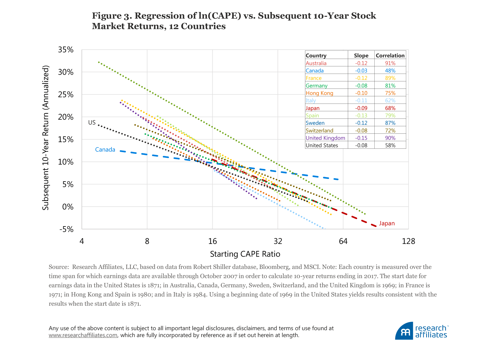 By dwelling on the potential flaws of a metric such as CAPE, it’s easy to become disillusioned and want to disregard it completely. Before we do that, let’s review what CAPE brings to the table. CAPE shows remarkable efficacy in forecasting long-term equity returns, not just in the United States but across the world,15 providing investors a consistent tool for comparing potential equity market investments. The fit is imperfect, but impressive.