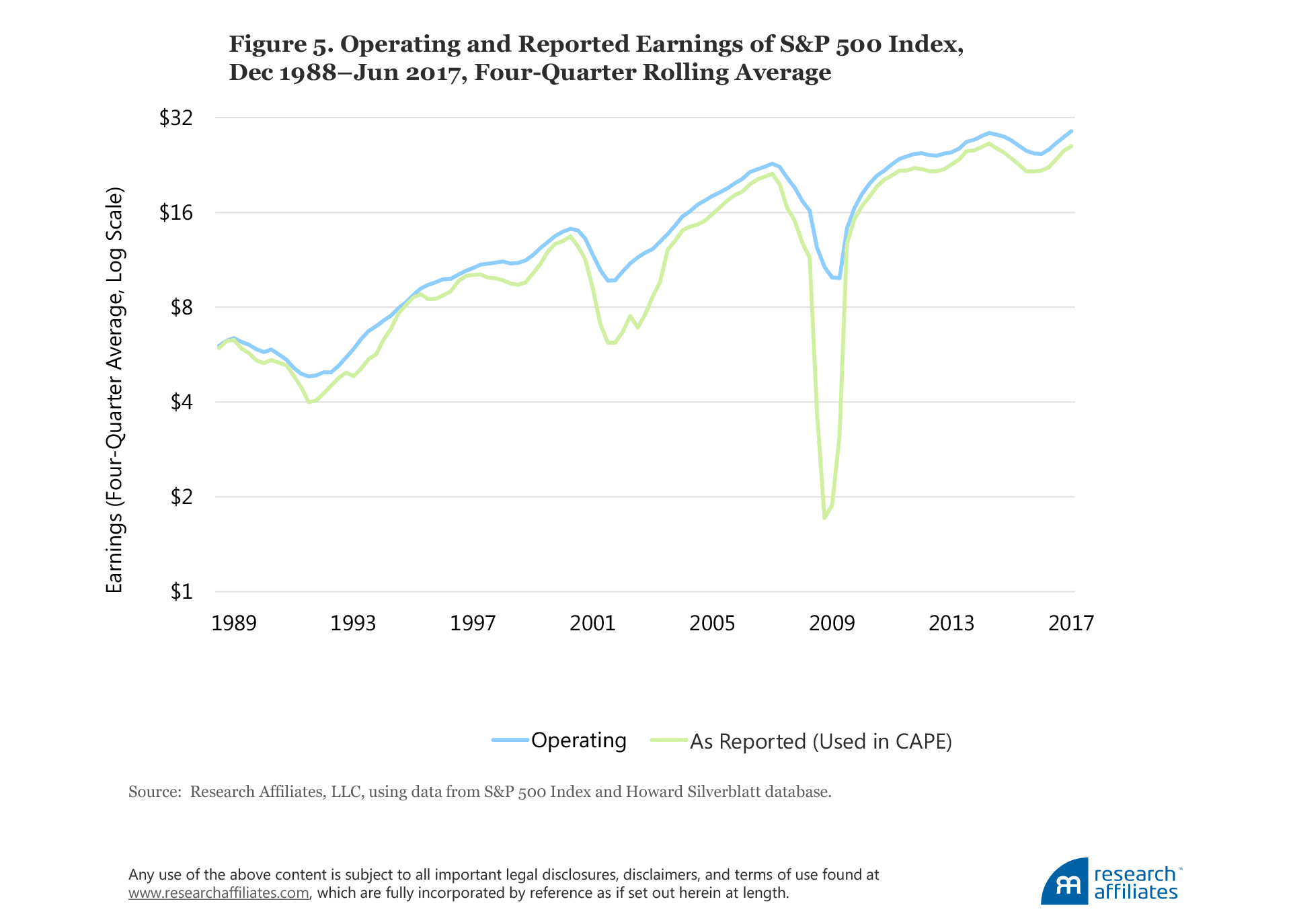 Wharton Professor Jeremy Siegel is one of the most outspoken critics challenging the relevance of the current high CAPE ratio in the US market. Siegel (2016), although not against using CAPE as a valuation tool, finds many problems with its denominator, the real earnings measure, which lead him to question whether the market is anywhere near as expensive as the CAPE ratio would suggest. He argues these problems with the denominator artificially boost current CAPE levels relative to historical norms. Siegel’s objections to the standard CAPE formulation fall into three categories: