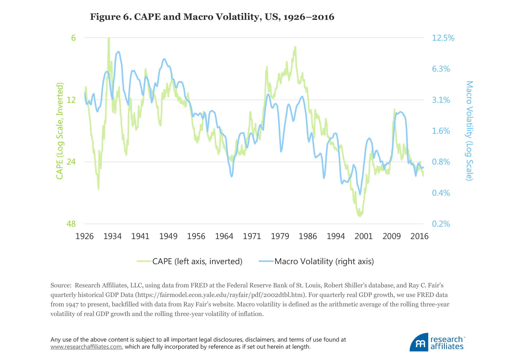 5. Our colleagues Aked, Mazzoleni, and Shakernia (2017) showed that economic volatility is powerfully linked to the CAPE ratio. When economic volatility is low, the natural CAPE ratio can be much higher. The Achilles’ heel in this relationship is that low economic volatility is unlikely to remain low indefinitely. Economic volatility exhibits strong mean reversion.