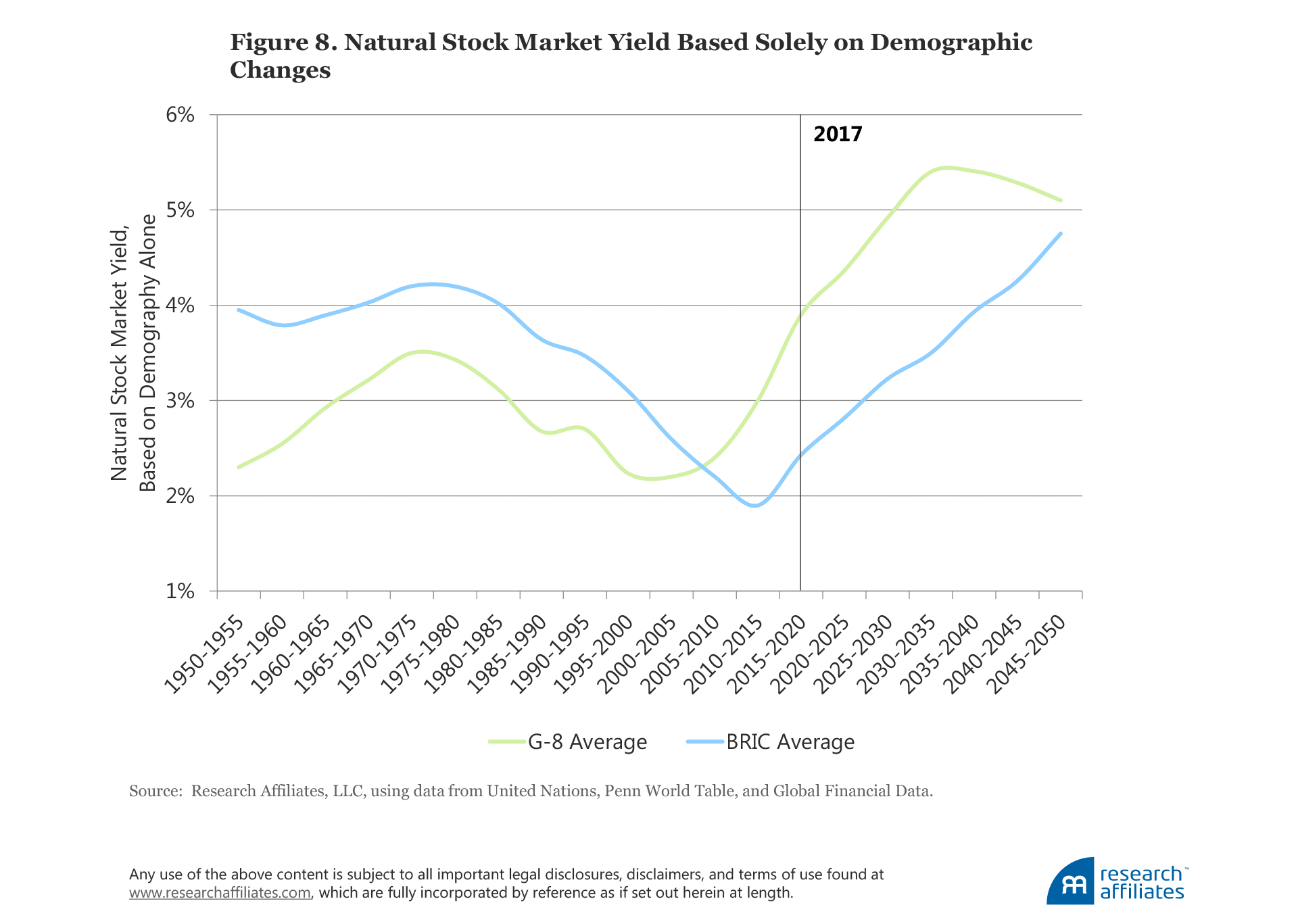 Chaves and Arnott (2012, 2013) used regressions across 30 countries, spanning 60 years, to gauge the linkage of demographic profiles with stock market returns. We have reversed this analysis in order to find the dividend yield that corresponds to those demographic profiles. When we are interpolating within demographic profiles that have been seen before, we can measure the uncertainty of our forecasts. When we are extrapolating past relationships to apply them to demographic profiles that have never been seen before, we cannot. So, extrapolation into uncharted territory is a far more dangerous use of this kind of model. Figure 8 illustrates that the high yields of the 1970s and the low yields of the 2000s were arguably a normal result of demographic pressures.