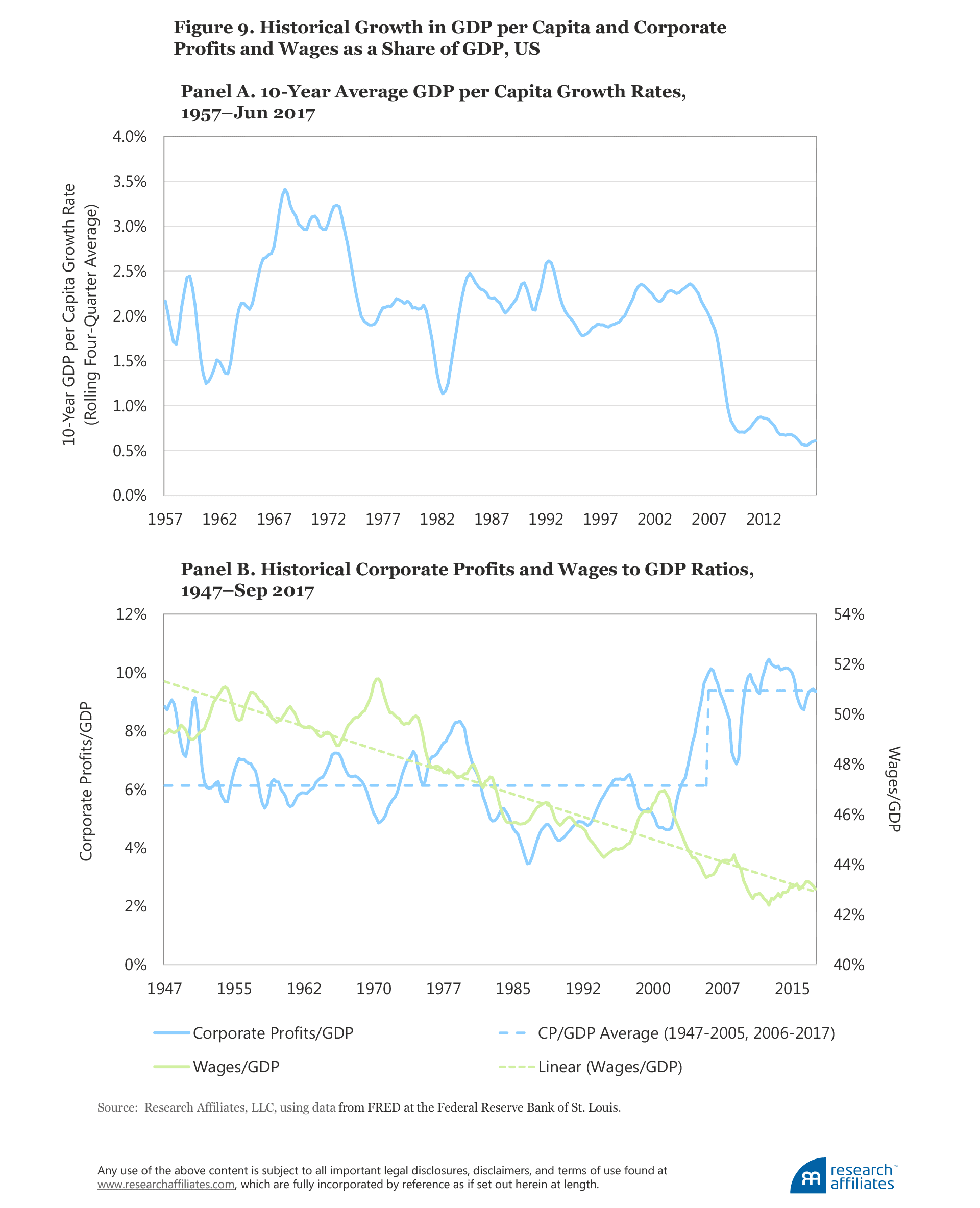 Maybe earnings as a share of GDP can grow further; after all, as we can see in Figure 9, Panel B, earnings have grown handily in the last decade, from roughly 6%—the long-run average before 2008—to more than 9% in recent years. Grantham views this transition as evidence of strong earnings, justifying a higher CAPE ratio.