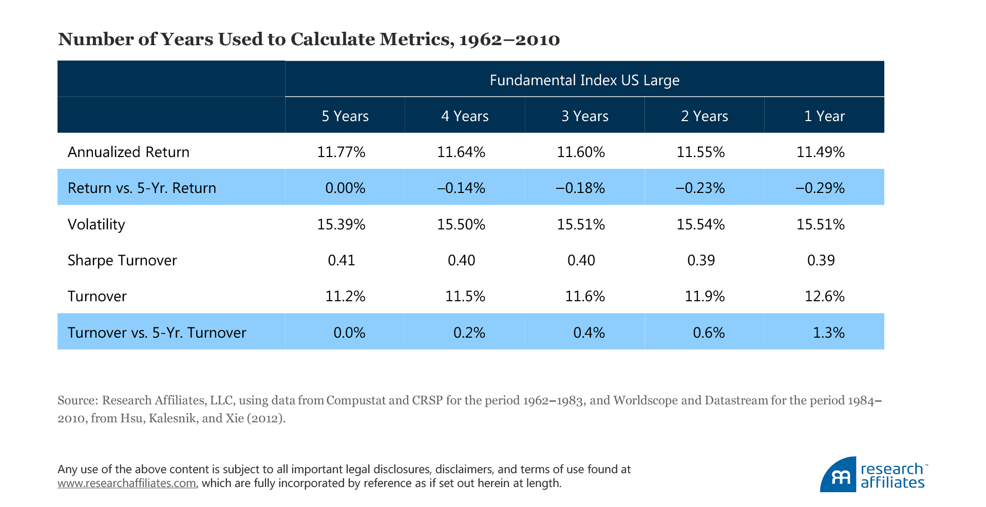 Almost every design choice represents a double-edged sword, and we ensure the choice is made only after gauging the other side of the potentially sharp blade. Whereas one-year data hold the freshest information, these data also impact a stock’s price most strongly. Therefore, a singular reliance on one-year financial information would introduce price-based stock selection and weighting through the back door, which would cause performance to decline and turnover to rise. By using a five-year average, we create a more stable anchor for rebalancing that leads to less trading and allows for smoothing the seasonality associated with accounting metrics in order to better capture a firm’s contribution to the economy through a full business cycle.