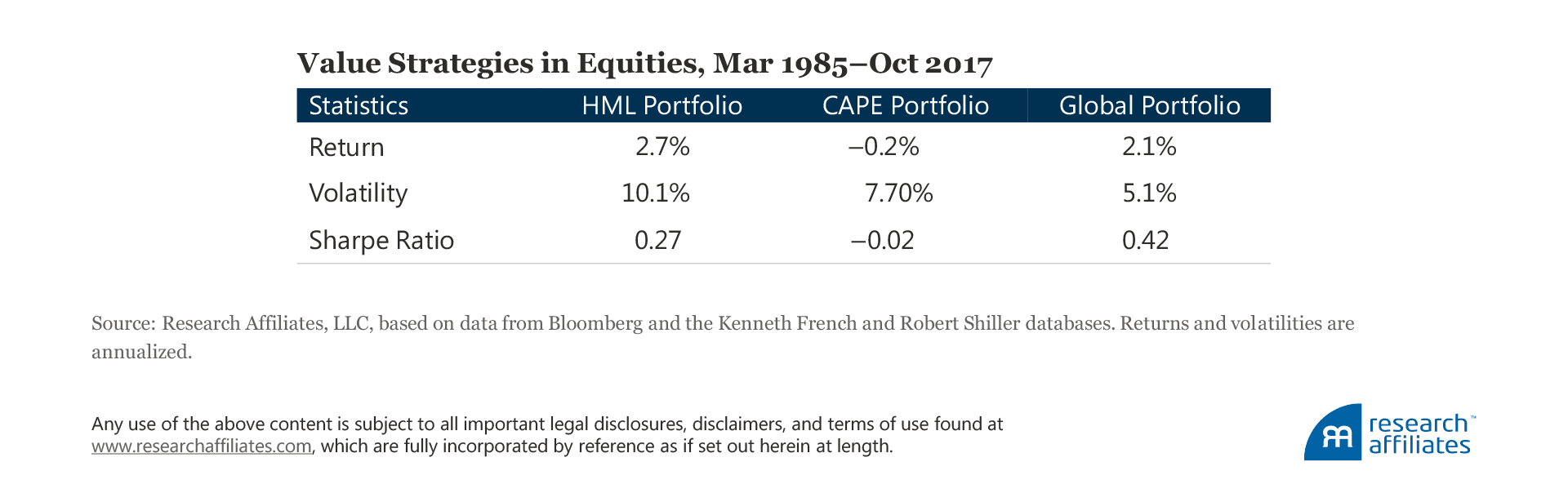 The historical evidence in the US market—a 0.38 Sharpe ratio for the HML portfolio and 0.20 for the CAPE portfolio from July 1926 through October 2017, both correlations are statistically significant—suggests that the value premium as traditionally applied is real, and that adjusting portfolio exposures based on these value metrics can lead to outperformance. But Benjamin Graham’s time-tested advice to “buy cheap and sell dear” does not need to be limited to single securities or markets. If buying below and selling above intrinsic value has proven effective both within the equity market and at the equity market level, we might naturally expect a value-oriented approach to prove fruitful when applied across the world’s equity markets.