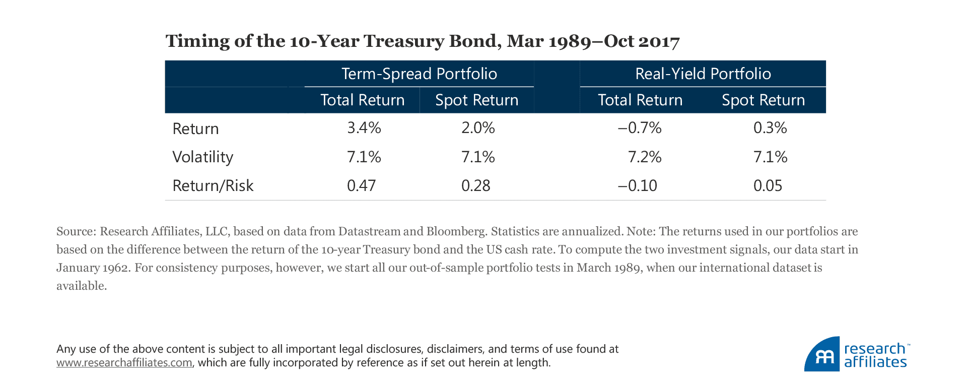Although we do not show it here, a look at the correlation (0.44) of the return of the term-spread portfolio with the return of a simple long-bond position further reveals the nature of the term-spread signal. Because of falling yields over the March 1989–October 2017 period, the term-spread portfolio has had a net positive bond market exposure, which entirely explains the spot component of its return. All in all, the term-spread signal did not display any obvious value tilt in our out-of-sample exercise applied to the US Treasury market.
