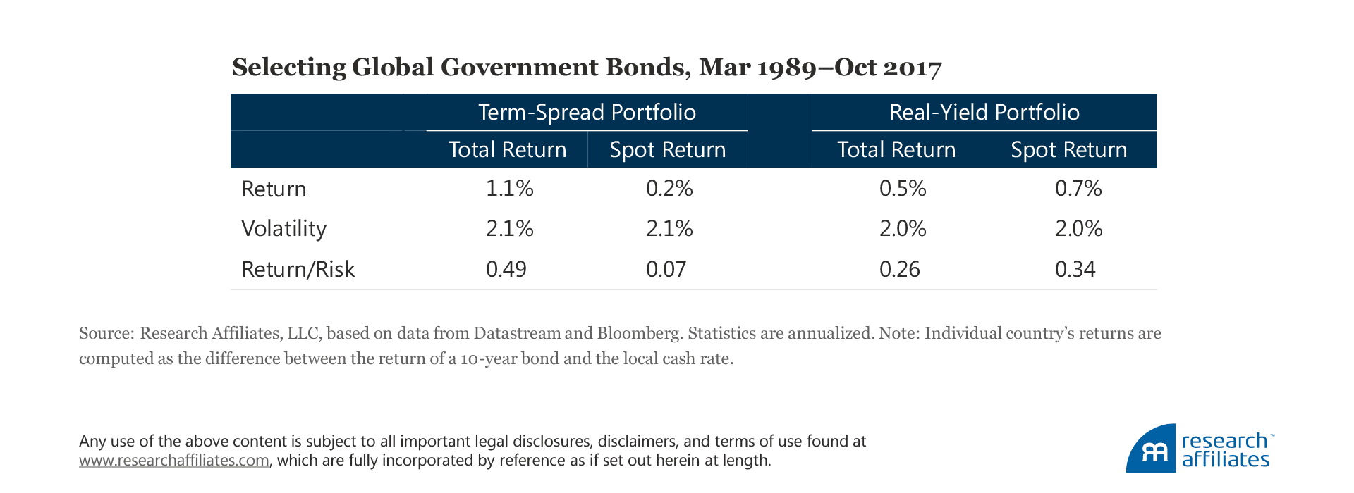 The global evidence is clear. By relying on cross-sectional information, the real-yield portfolio offers a positive excess return, all of which is in the form of spot price movements (spot return of 0.7% versus total return of 0.5%). In addition, the correlation between the returns of the global portfolio and its original US version is positive (0.26), further lending support to its economic rationale. Instead, the correlation with the return of the global term-spread portfolio is negative (−0.33), indicating the difference in nature between these two strategies.