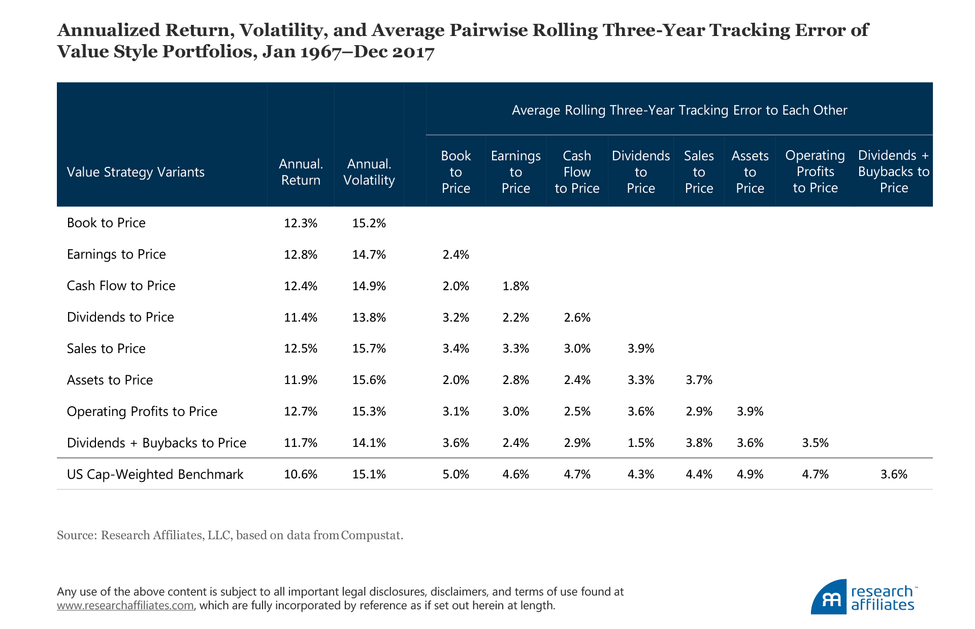 Consider eight hypothetical long-only value strategies, all using the sameconstruction method with just one variation, the value signal definition: book to price, earnings to price, cash-flow to price, dividends to price, sales to price, assets to price, operating profits to price, and dividends-plus-buybacks to price, respectively. Because they are all value strategies based on a priori equally valid metrics, our prior would be to expect them to deliver reasonably similar return outcomes over the long run. And yes, all generate an annualized return within a modestly narrow band of 11.4% to 12.8% over a 50-year period ending December 31, 2017.