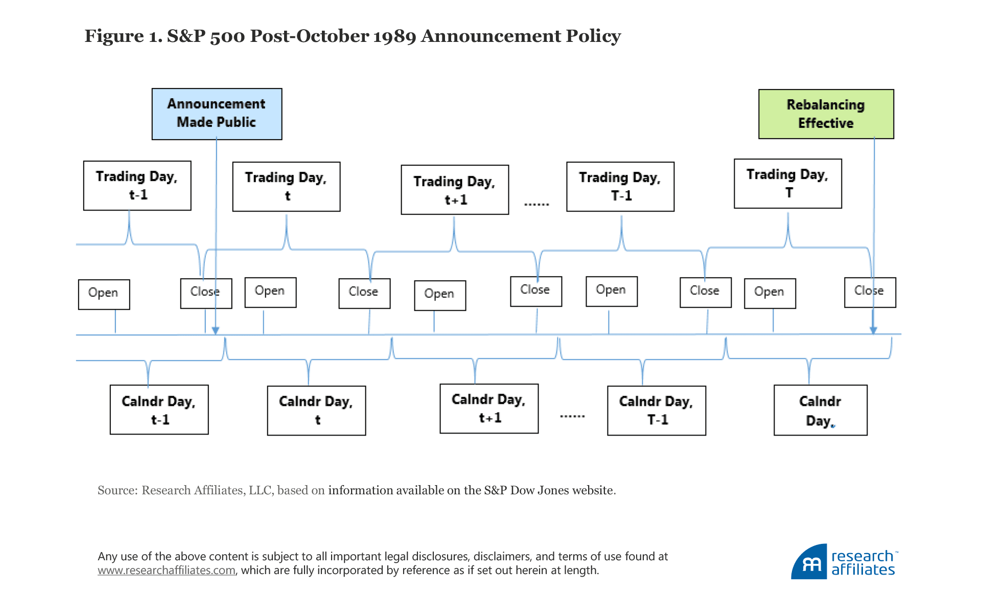 Until October 1, 1989, Standard & Poor’s policy was to announce changes in the S&P 500 after the market had closed, with those changes taking effect at that day’s closing price. No index fund manager could trade before the index had already been altered. As a result, the overnight return variances arising from the different holdings of the index and the index-tracking funds showed up as tracking error for the funds versus the index. Also, any trading costs the index funds incurred in buying or selling the added or deleted stocks showed up as underperformance because they had to trade after the index changes were made at the higher (added stocks) or lower (deleted stocks) prices driven by the resulting shift in demand, reflecting the market impact of rebalancing-related trading. Many empirical studies examined the pre-1989 period and documented stock-price movement immediately after changes were made in the composition of the S&P 500. The first studies revealed and measured the S&P 500 reconstitution effect.1 In the period January 1970–September 1989, on average, additions experienced a positive abnormal return (3.0%) and deletions experienced a negative abnormal return (–1.4%) on the day after the announcement. Index fund trades (and hedge fund front-running of those trades) are the presumptive cause of this 4.4% spread. In October 1989, as illustrated in Figure 1, Standard & Poor’s began pre-announcing changes to the index along with the rebalancing date (known as the “effective date”) when those changes would occur, which could be days or weeks after the announcement date. On the effective date, changes in index holdings are made at the market closing price.