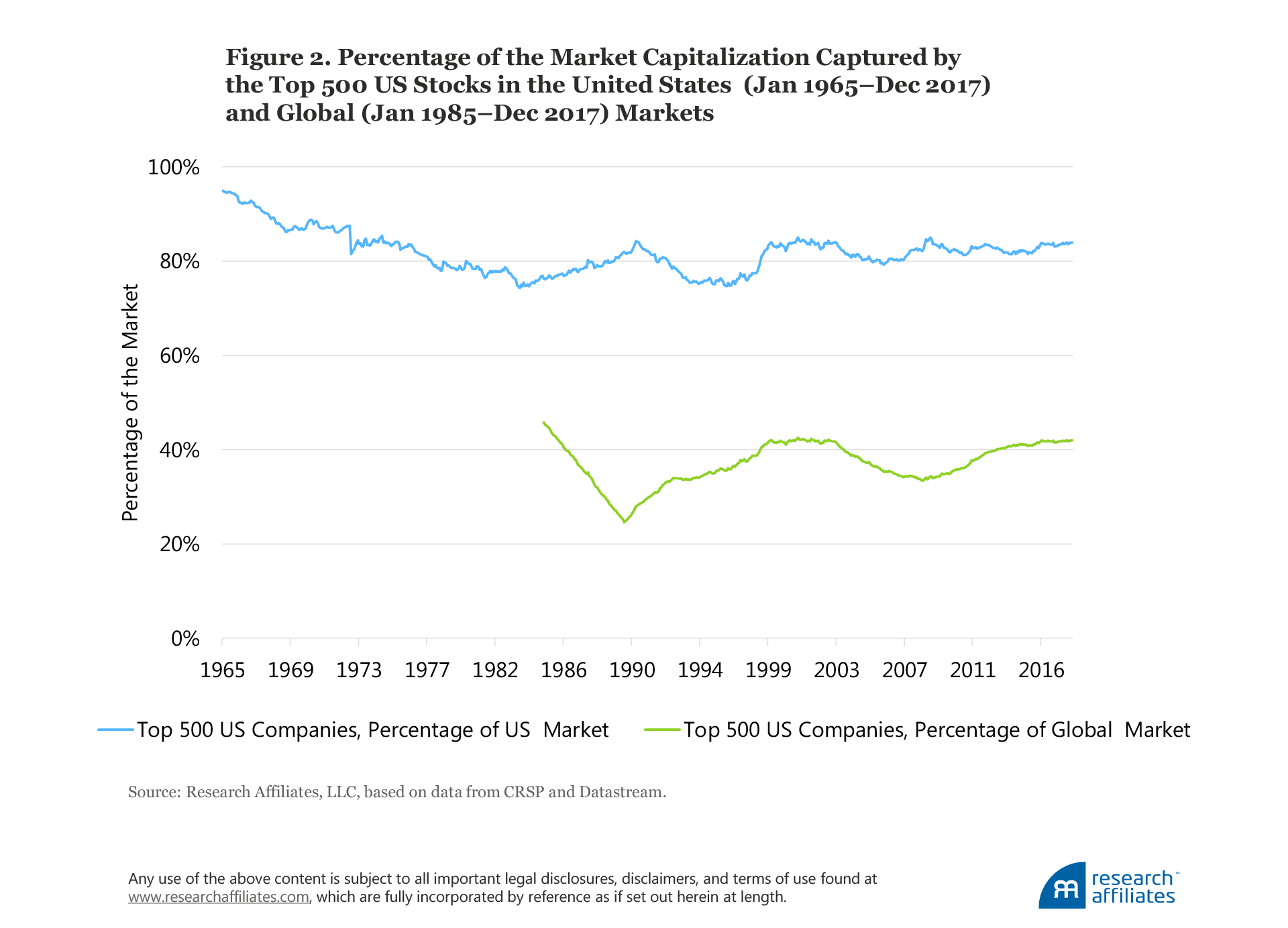 Theoretically, the market portfolio should comprise all the investments we collectively hold as a global community, including our own human capital, real estate, discounted obligations from state-run entitlement programs, and illiquid markets such as venture capital or energy partnerships. Frequently investors in a fund tracking the S&P 500 believe that they are invested in the market portfolio—far from it. Figure 2 shows the market size of the 500 largest US companies as the fraction of the US market from 1965 through 2017 and as the fraction of the global equity market from 1985 through 2017. On average, these companies only capture about 80% of the US equity market and about 40% of the global equity market, respectively, let alone the total of the investable market.