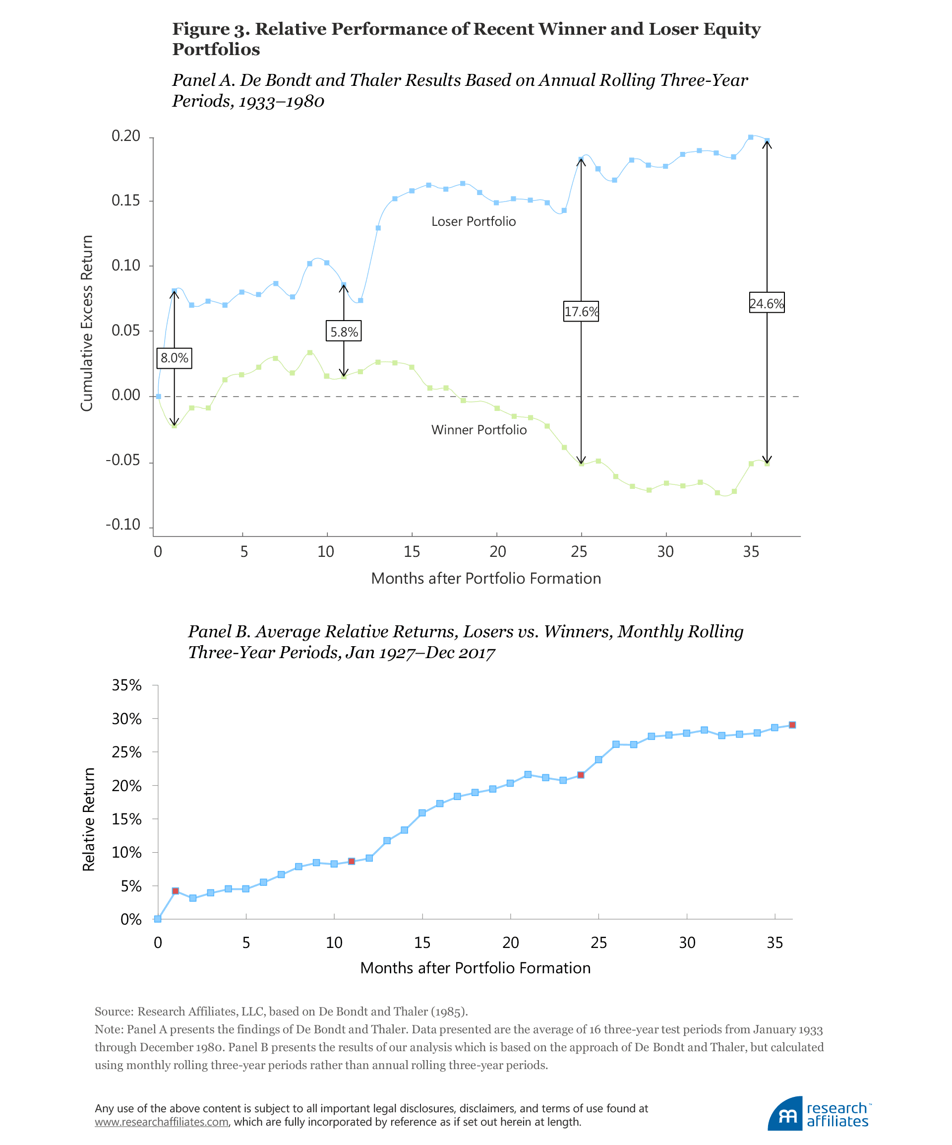 De Bondt and Thaler relied on an average return across annually rolling three-year periods (i.e., January 1933 through December 1935, January 1934 through December 1936, and so forth). Therefore, any calendar effects—notably, the January effect—should show up in their results, as illustrated by the jumps in months 1, 13, and 25. Our replication of their work uses monthly rolling three-year periods (i.e., January 1933 through December 1935, February 1933 through January 1936, and so forth) and spans over 90 years of data, including the first three-year “seed” span from January 1927 through December 1929, and the last three-year result span from January 2015 through December 2017. Our results, presented in Figure 3, Panel B, vividly reinforce the findings of De Bondt and Thaler with far higher statistical significance because the seasonality disappears, and should dispel any illusions that the market is efficient, at least with regard to the tendency for mean reversion in long-term price movement.