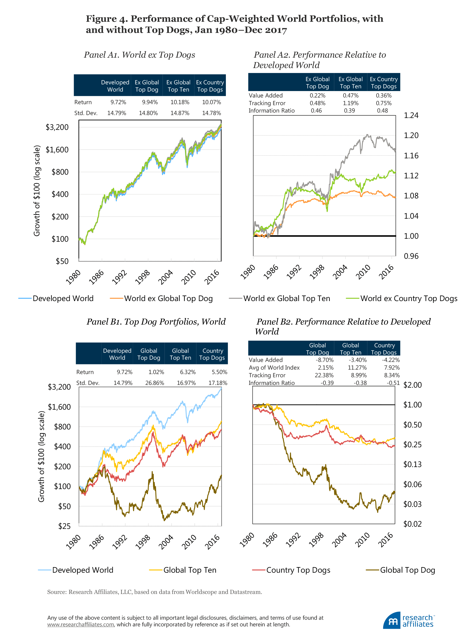 Investing in traditional cap-weighted indices has a negative impact on portfolio returns that arises from four sources: 1) the buy-high/sell-low dynamic of adding and deleting stocks in the index in which the newly large companies added to the index tend to be newly expensive and tend to mean revert downward in price after their addition, while the newly small companies deleted from the index tend to be newly cheap and tend to mean revert upward in price after their deletion; 2) the tendency for the top dogs (largest market-cap stocks in each sector or country) to underperform for protracted spans after achieving top-dog rank (and top-dog weight in the index funds!); 3) turnover, with all of its associated trading costs; and 4) index construction that chases the recently hot names rather than patiently reconstituting the index based on recent market cap, averaged over several years, and with banding to avoid the flip-flops.