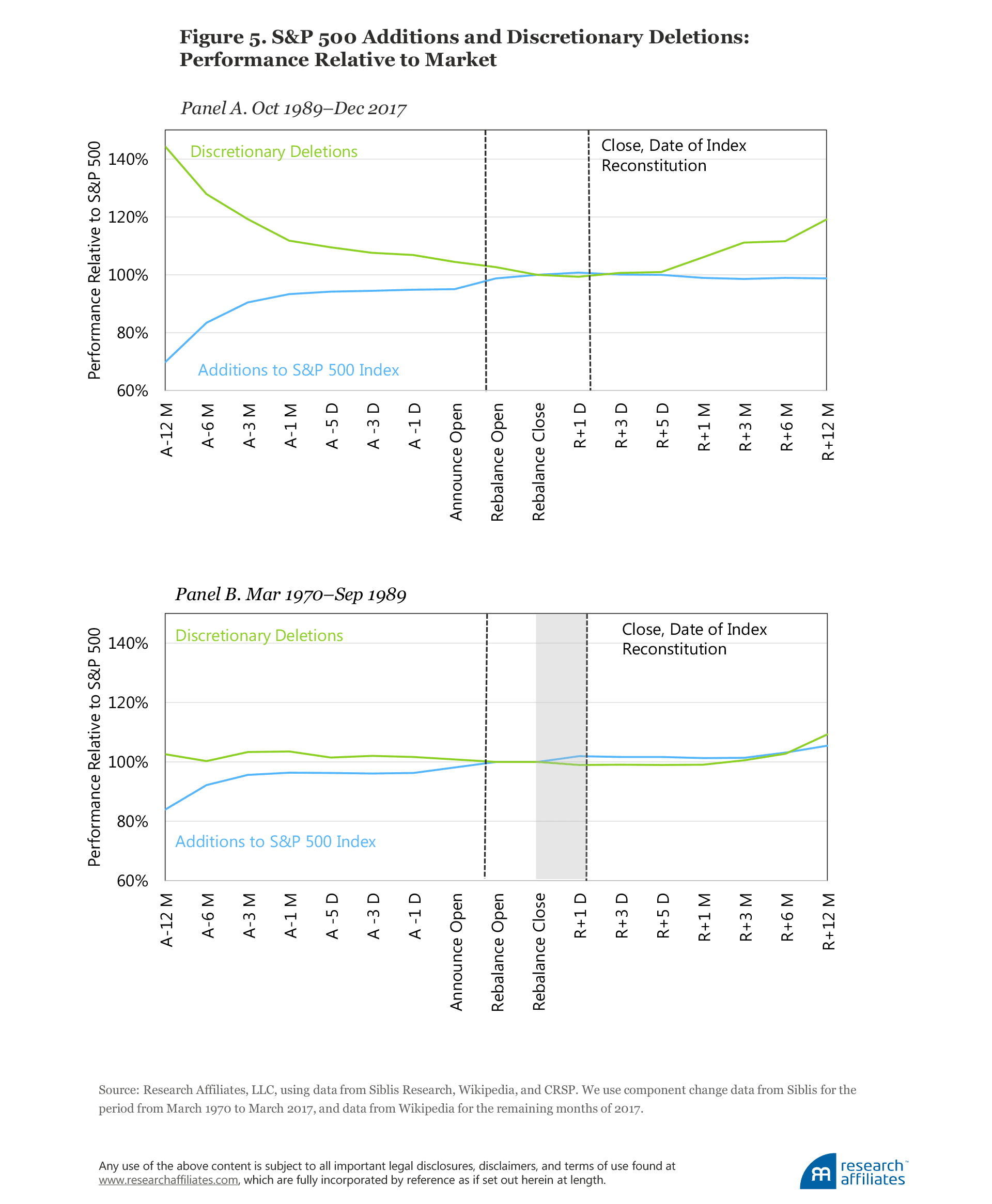 The buy-high/sell-low pattern of the S&P 500 is demonstrated for the period October 1989–December 2017 in Figure 5, Panel A, which graphically replicates the results in Table 5. The stocks added to the index beat the market, on average, by 30% in the year prior to the rebalancing date, while the stocks sold by the index lagged the market by about 45% over the same period. After the rebalancing date, this situation reverses, and the deletions beat the additions by over 20%, with the lion’s share of the difference coming from the deletions.21