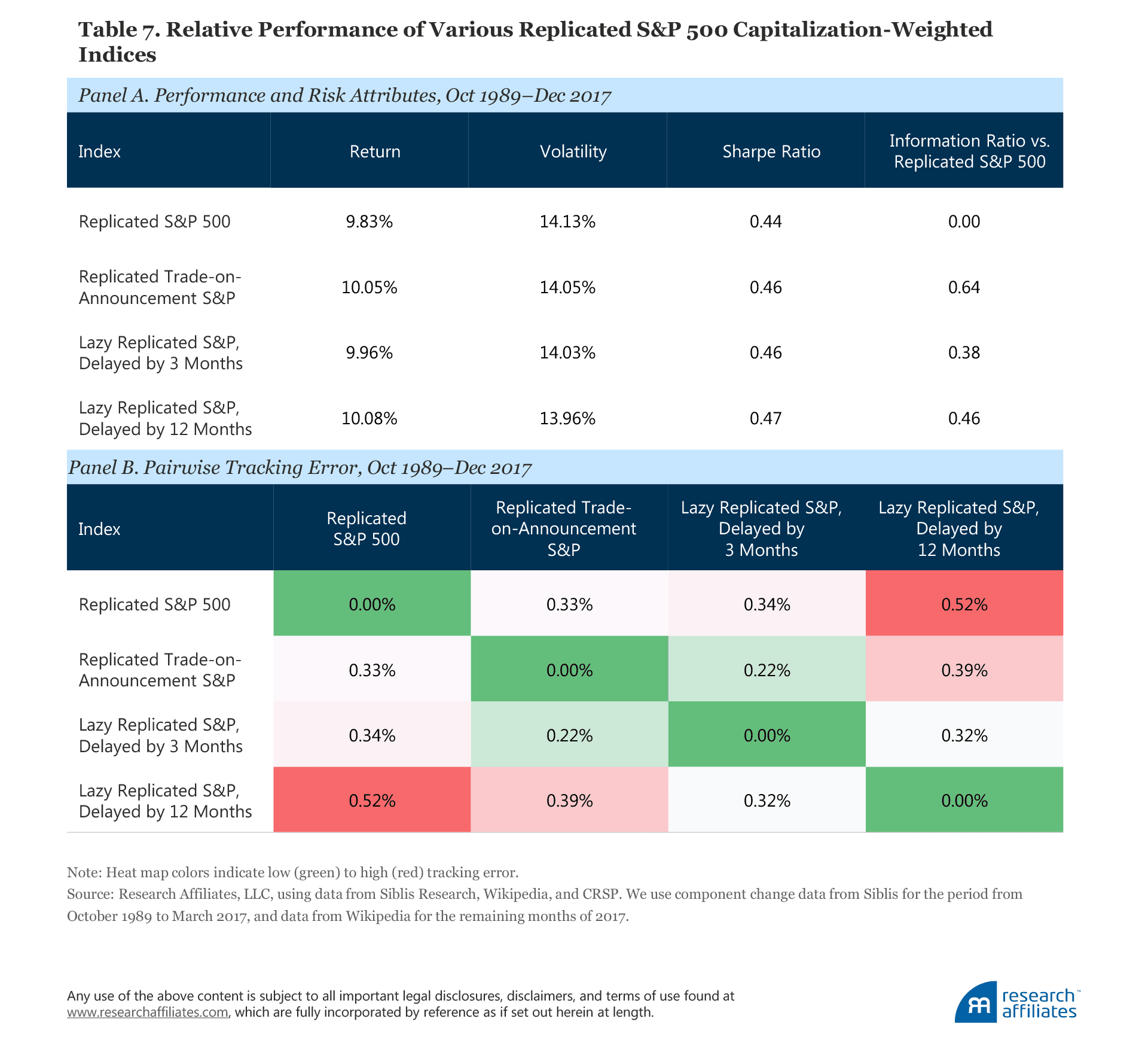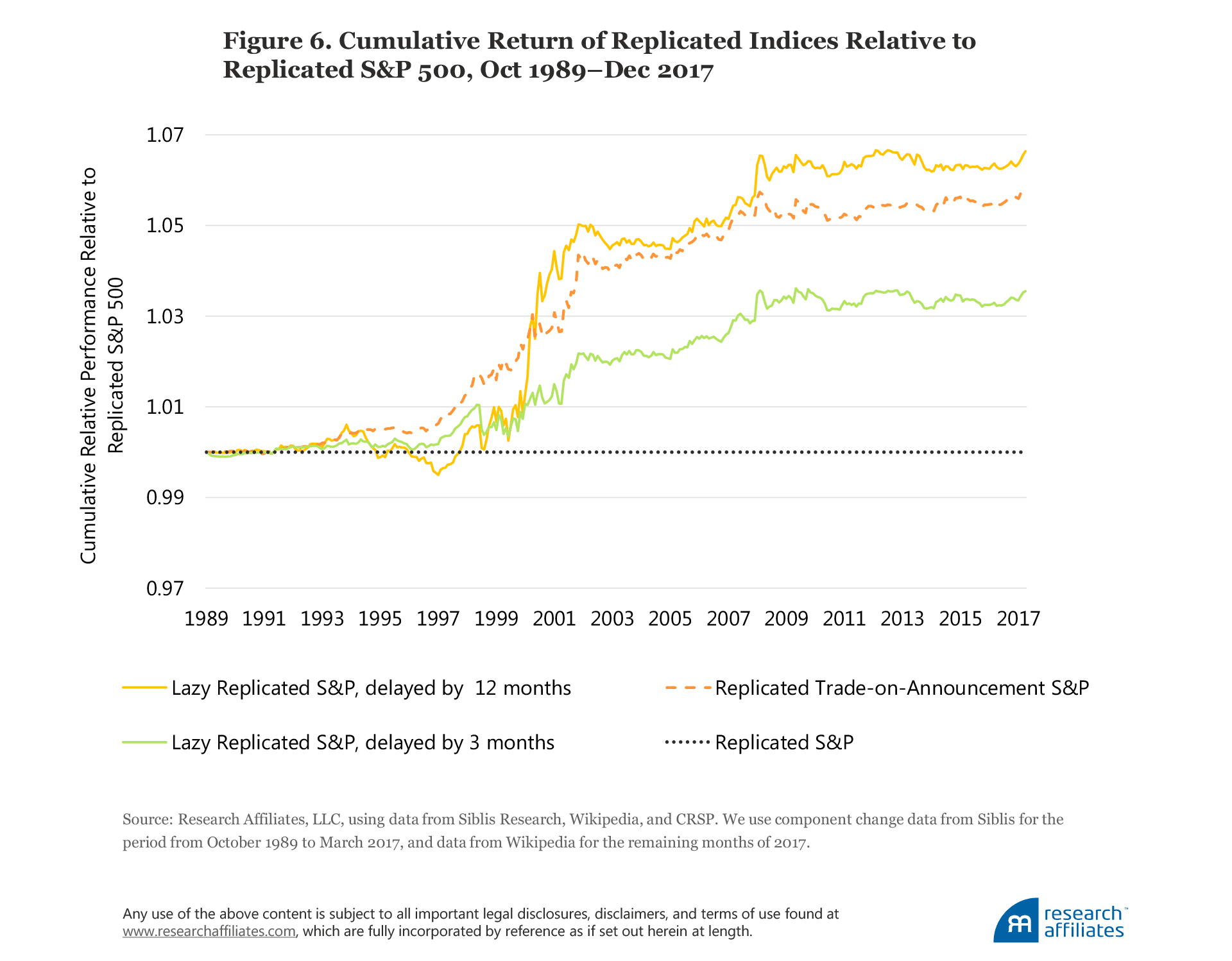 Lazy Replicated S&P 500. The actual S&P 500 buys stocks at lofty valuations and sells them at deeply depressed valuations. The index performance suffers as the prices subsequently revert to the mean. We simulated a lazy replicated S&P 500 that delays trades by several months (we show results for 3 and 12 months) after a large portion of the mean reversion in price has occurred. Delaying trading inevitably causes tracking error versus the actual S&P 500. Unlike the trade-on-announcement index, the lazy index is easy to implement and the difference in its performance versus the replicated S&P 500 captures the impact of mean reversion on index performance.24