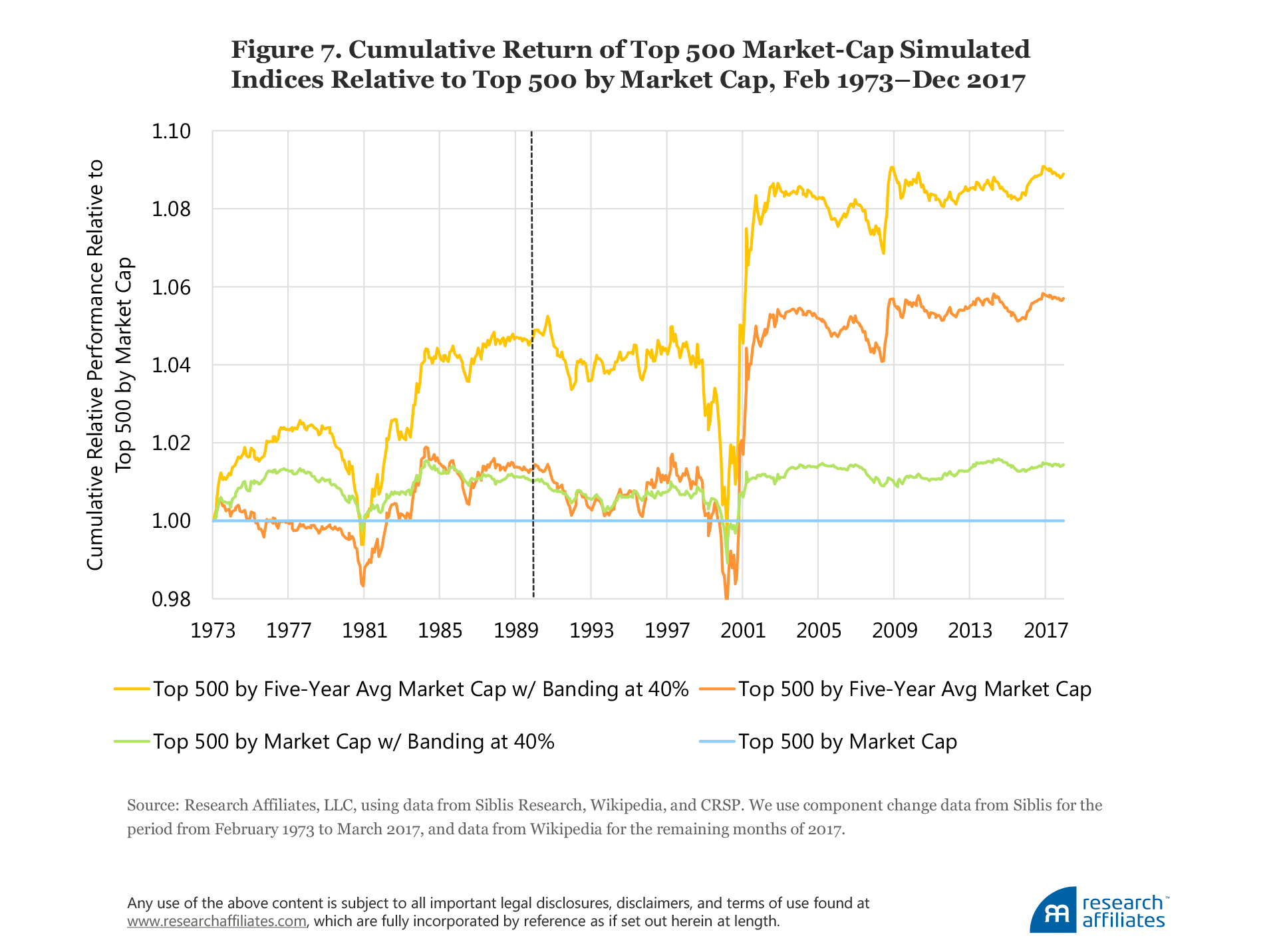 Figure 7 graphically shows the relative performance of these lazier cap-weight indices compared to the top 500 by market-cap portfolio. Although the gains are, of course, episodic, they are reasonably reliable on a rolling five-year basis, failing mainly during growth-dominated bubbles, such as in 1980 and in 1999.