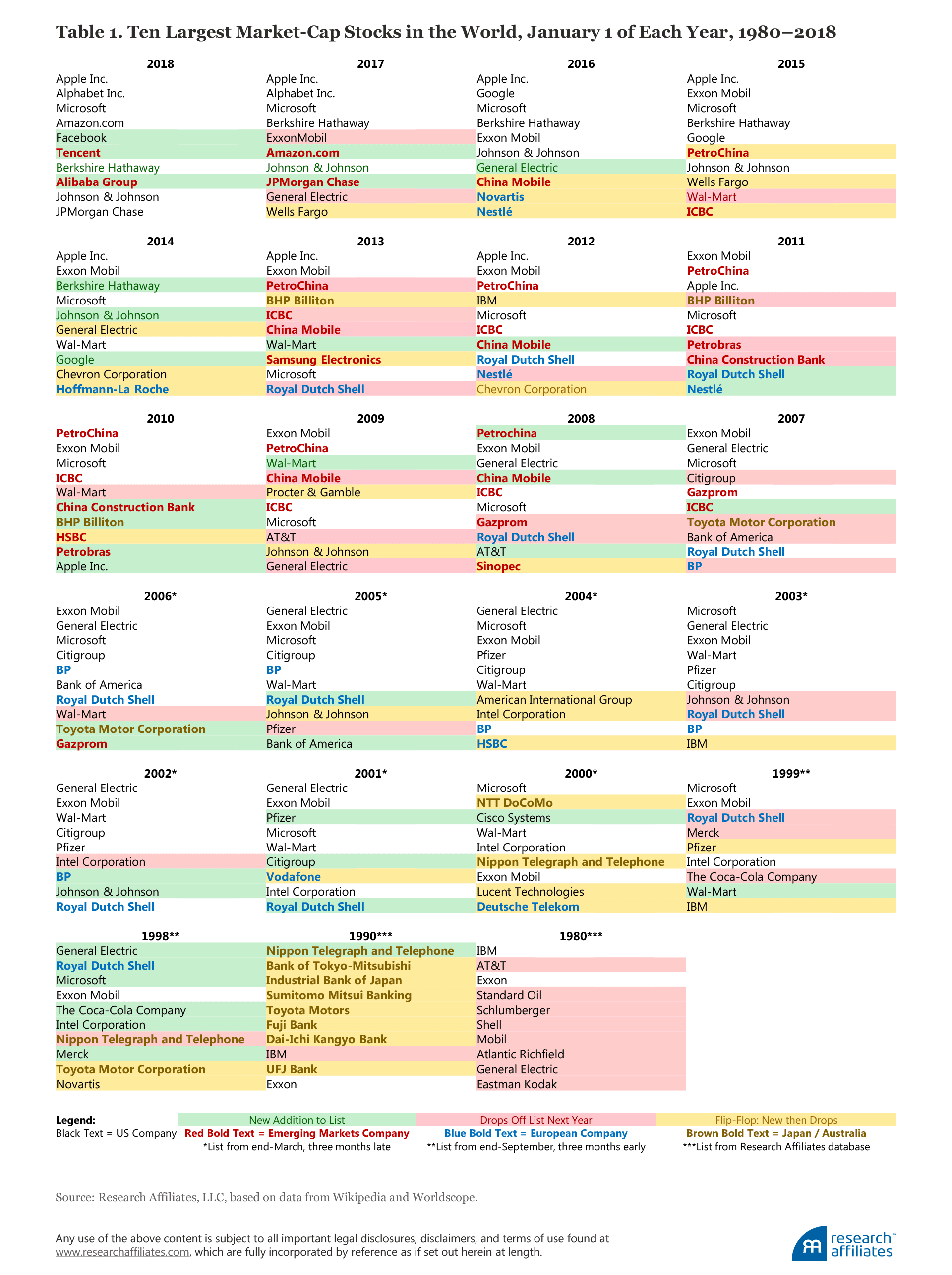 Let’s look back year by year over the last 20 years, and include 1990 and 1980 for good measure. Table 1 shows that the rotation of the top 10 largest market-cap stocks in the world has been prodigious. Of the 10 largest in 1980, just 2 stocks (IBM and Exxon) were still on the list in 1990. Of the 10 largest in 1990, just 2 (Japan’s National Telephone and Telegraph, or NTT, and Exxon) were still on the list in 2000. Of the 10 largest in 2000, just 2 (Microsoft and Exxon-Mobil) were still on the list in 2010. Of the 10 largest in 2010, just 2 (Microsoft and Apple) were still on the list at the start of 2018. Finally, in the most recent and extreme 10-year span, only 1 of the top 10 market-cap stocks in 2008 (Microsoft) remained on the list at the beginning of 2018.