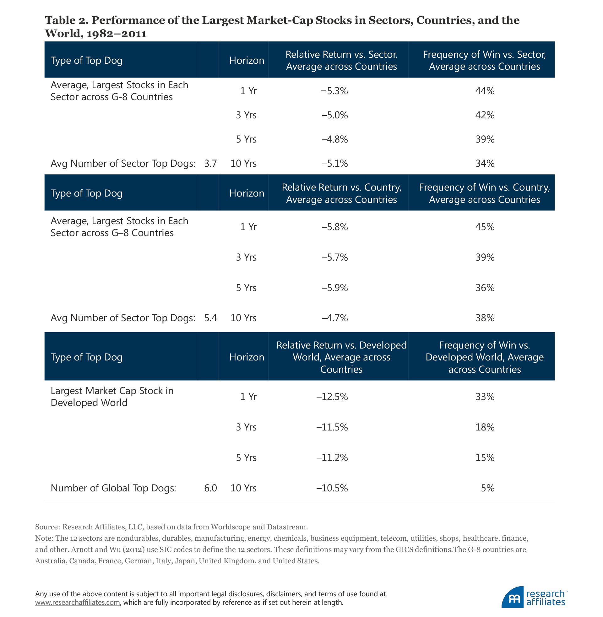 We have shown that the largest market-cap stocks in the world (and in any given sector or country) have disturbingly high odds of underperforming the world market (or sector or country), and that the magnitude of underperformance does not seem to dissipate over subsequent spans of as long as 10 years. Although it is highly unlikely an index fund would choose to eliminate Apple from its portfolio, a modestly lower weighting of sector and country top dogs should merit consideration, along with careful attention to the resulting tracking error.