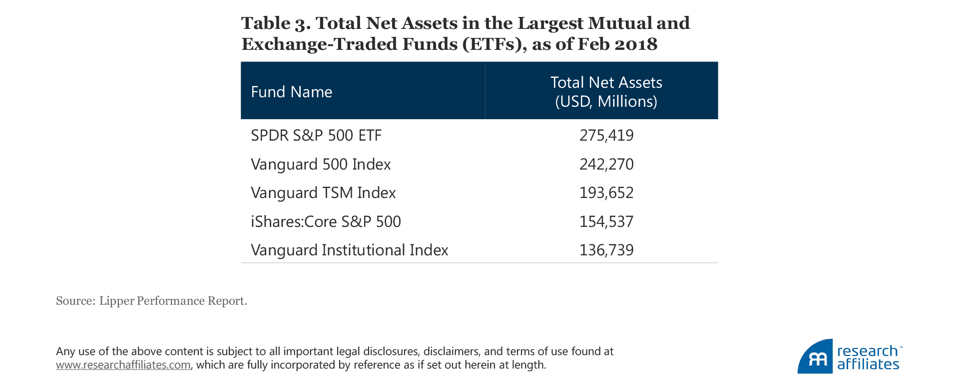 Broad market indices were not originally created to be investment strategies. They were created to measure the performance of the stock market. When Standard & Poor’s launched the S&P 500 in 1957, their management team hardly expected trillions of dollars would be invested in strategies that track it.13 Yet according to our estimates, by the end of 2017, $4.1 trillion was indexed to the S&P 500 alone.14 In Table 3, we list the top five US mutual funds and ETFs, which are all cap-weighted index funds, and their total net assets as of February 2018.