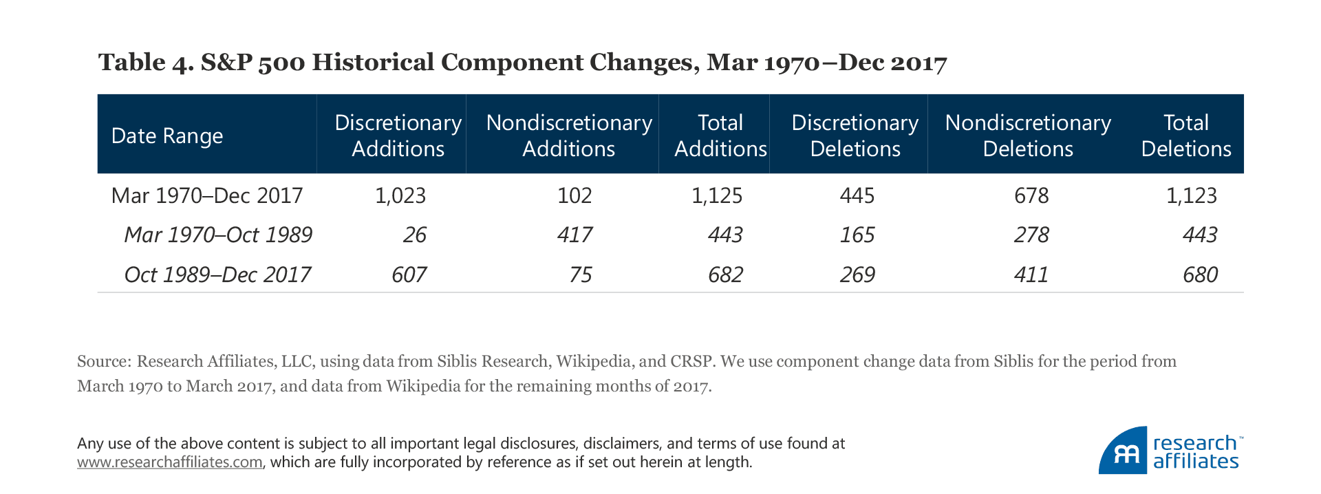 The much larger number of nondiscretionary deletions compared to nondiscretionary additions is a reflection of corporate actions: large companies are more likely to consolidate their businesses or to be acquired (the main sources of nondiscretionary deletions) compared to spinning off a large segment of their business (the main source of the nondiscretionary additions). We provide more detail on the nature of additions and deletions by subperiod in Table 4.