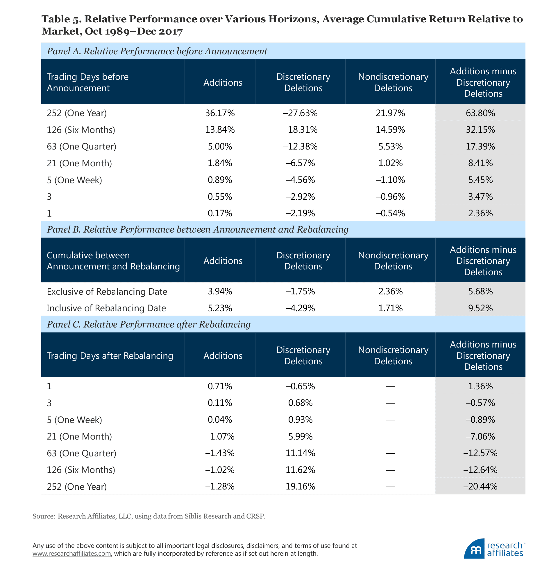 In the first year (or in the 252 equity market trading days) following the effective date, additions suffered a modest performance drag of 1.28%, while the deletions outperformed the market by 19.16%, a performance difference of 20.44% (Table 5, Panel C). If we exclude the first day after the effective date, when the additions continued to outpace the deletions, discretionary deletions beat additions by 21.80%.