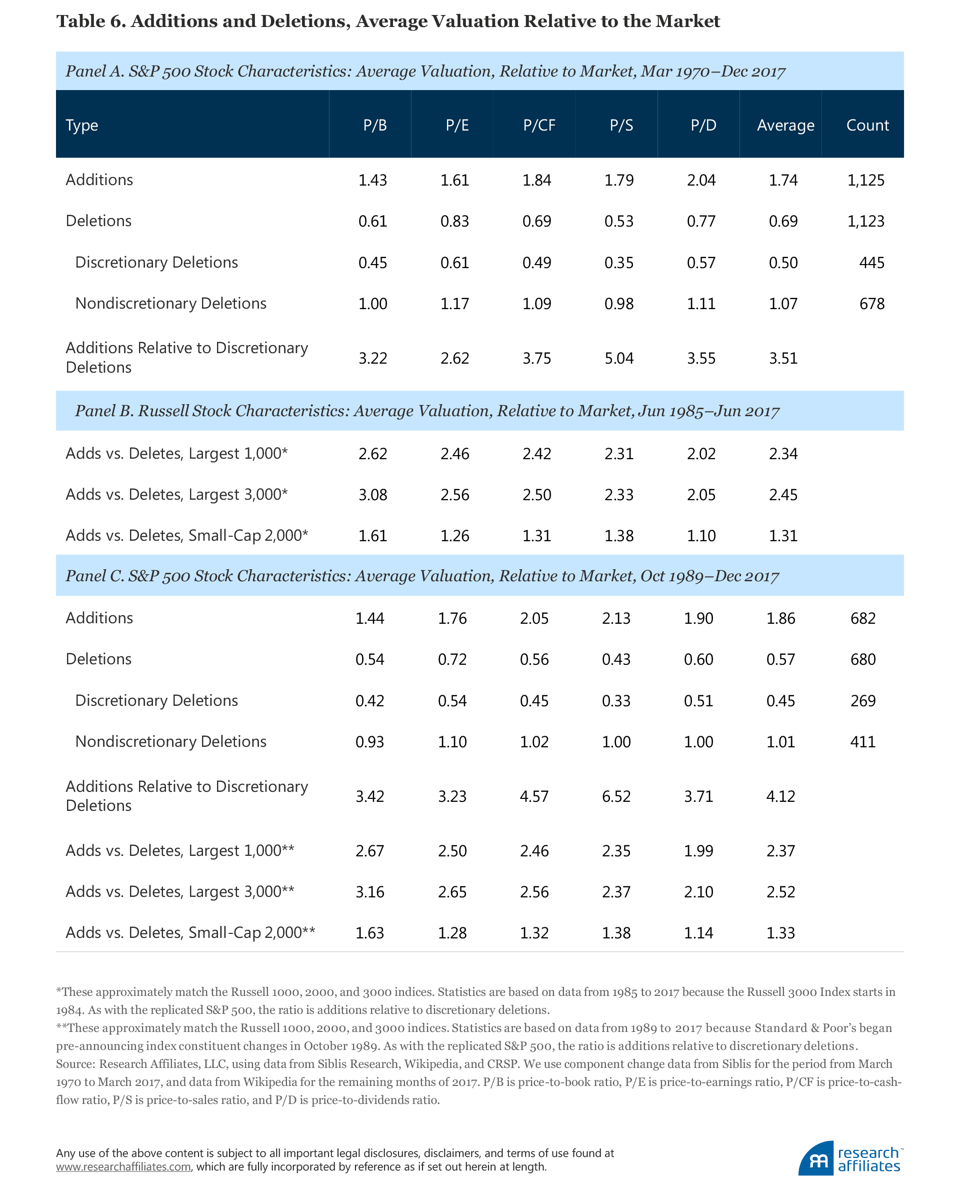 We find the post-rebalancing reversal of performance for the additions and deletions unsurprising when we examine the valuation ratios of additions and deletions relative to the market, as shown in Table 6.20 The additions, based on an average of P/B, P/E, P/CF, P/S, and P/D, are 74% more expensive than the market. The discretionary deletions, in contrast, are 50% cheaper than the market based on the combination of the five valuation measures. When the additions are 3½ times as expensive as the discretionary deletions, the performance spread of over 20% between the additions and discretionary deletions in the subsequent year is nothing more than a combination of the value effect and mean reversion.