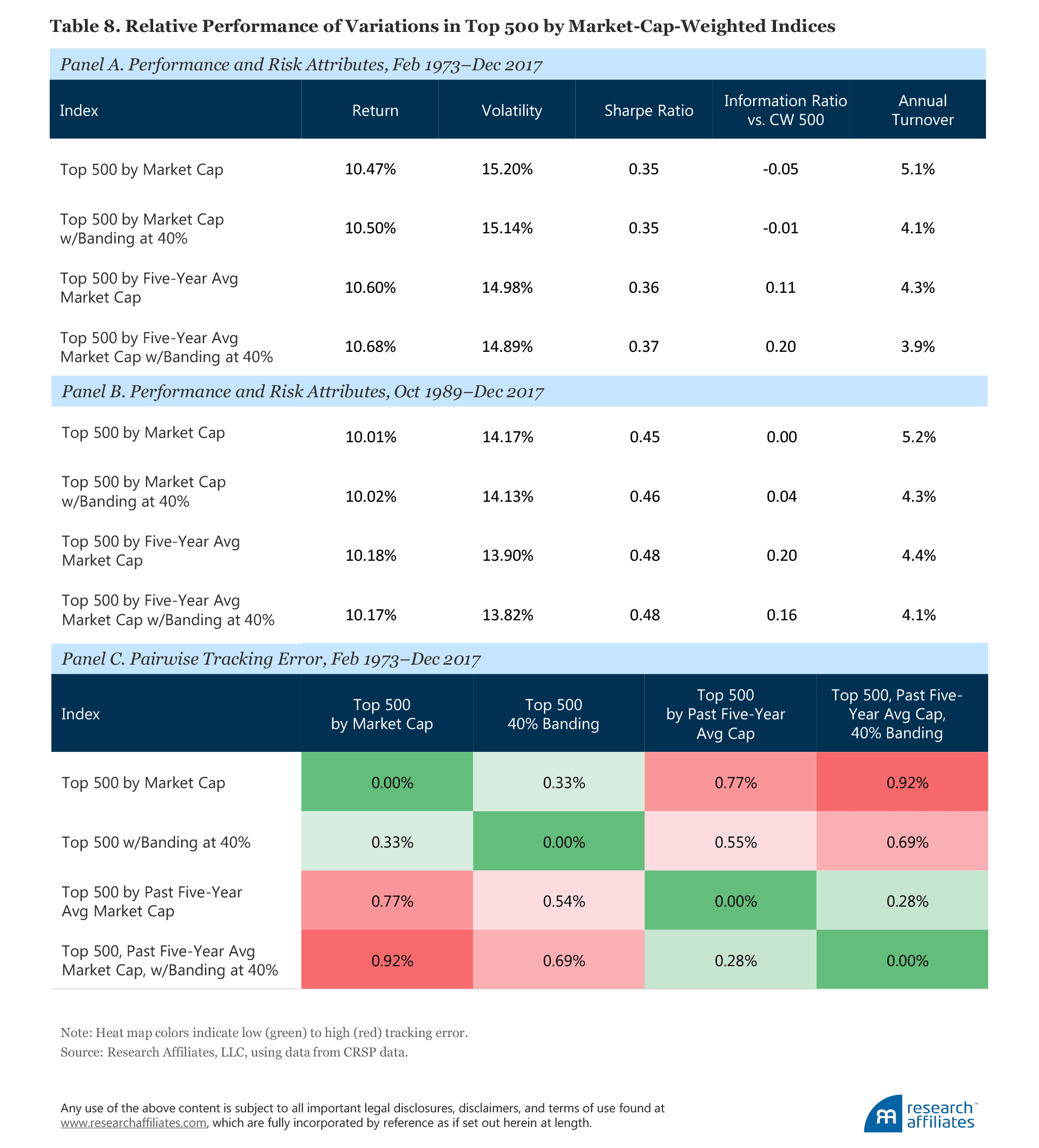 Most studies of price impact document that transaction costs increase as the amount traded over a short period of time increases, and therefore implies that turnover-lowering techniques will reduce transaction costs.28 When both five-year averaging of market capitalization and banding are applied, the resulting portfolio outperforms both the top 500 by market-cap portfolio and the S&P 500 by 20–21 bps from February 1973 to December 2017, and lowers annual turnover for the same period to 3.9%, about 10% lower than S&P 500 turnover and about 25% lower than for the top 500 by market-cap portfolio. If the costs associated with the buy-high/sell-low dynamic and with turnover can be reduced by about 22–23 bps through reducing return drag, the associated total savings for the total of S&P 500 investors would be about $8.6 billion.29