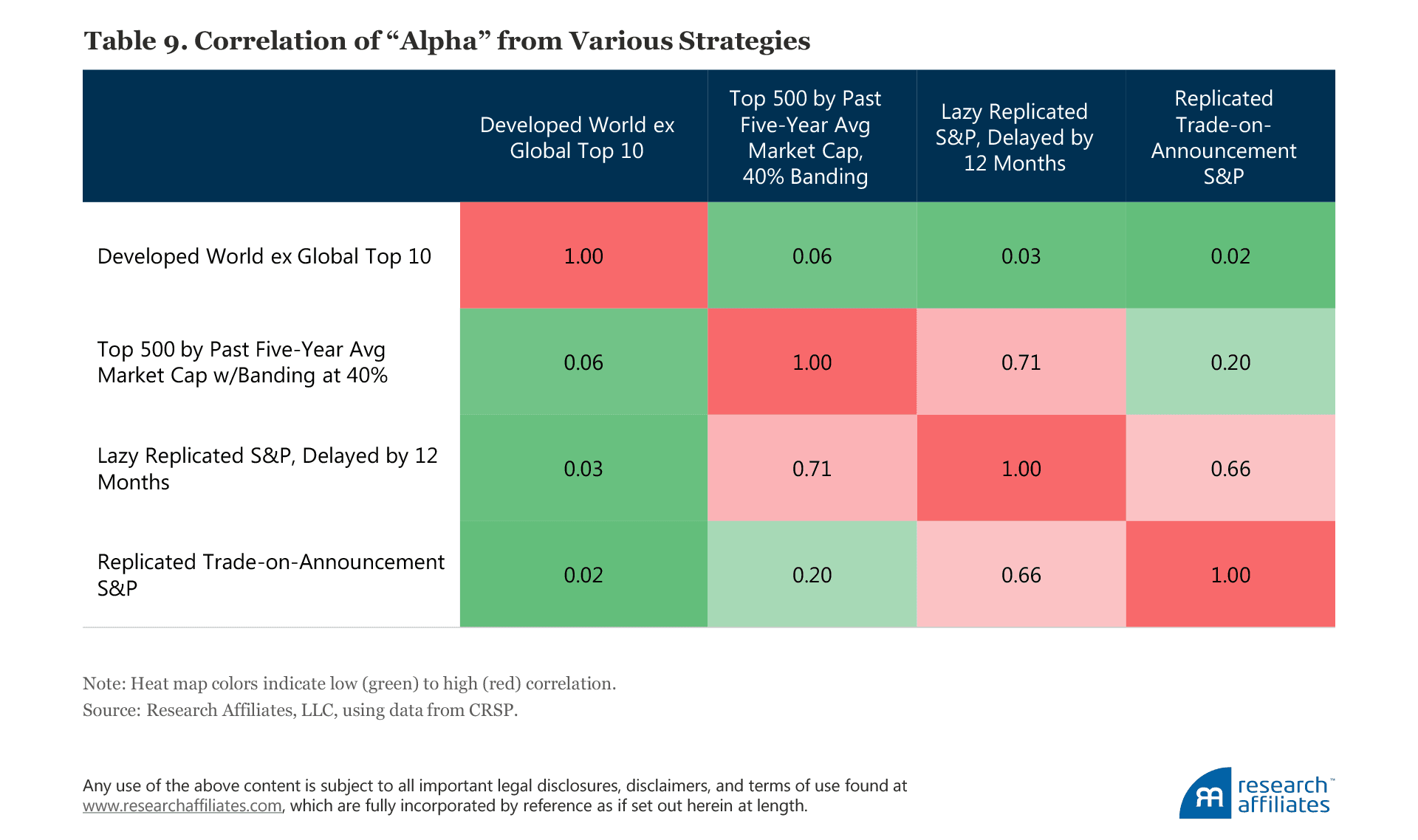 30. Granted, we are venturing into the realm of data mining, but we find that when the following three strategies are combined in proportions of 1:1:3, approximately 14 bps of value is added with 25 bps of tracking error: global world ex top 10 global stocks, lazy replicated S&P 500 delayed by 3 months, and lazy replicated S&P 500 delayed by 12 months. If we add the replicated trade-on-announcement S&P 500 as the fourth driver of return (which is not easy to reliably replicate, but can be roughly approximated) and assign weights in the proportions of 1:1:3:13, with the last weight of 13 given to the replicated trade-on-announcement S&P 500 strategy—the value-add is 18 bps with tracking error of 25 bps. Giving the 18 bps a haircut to account for the fact that without private information a total replication of the replicated trade-on-announcement S&P 500 is impossible, we arrive at a value-add of 15 bps.