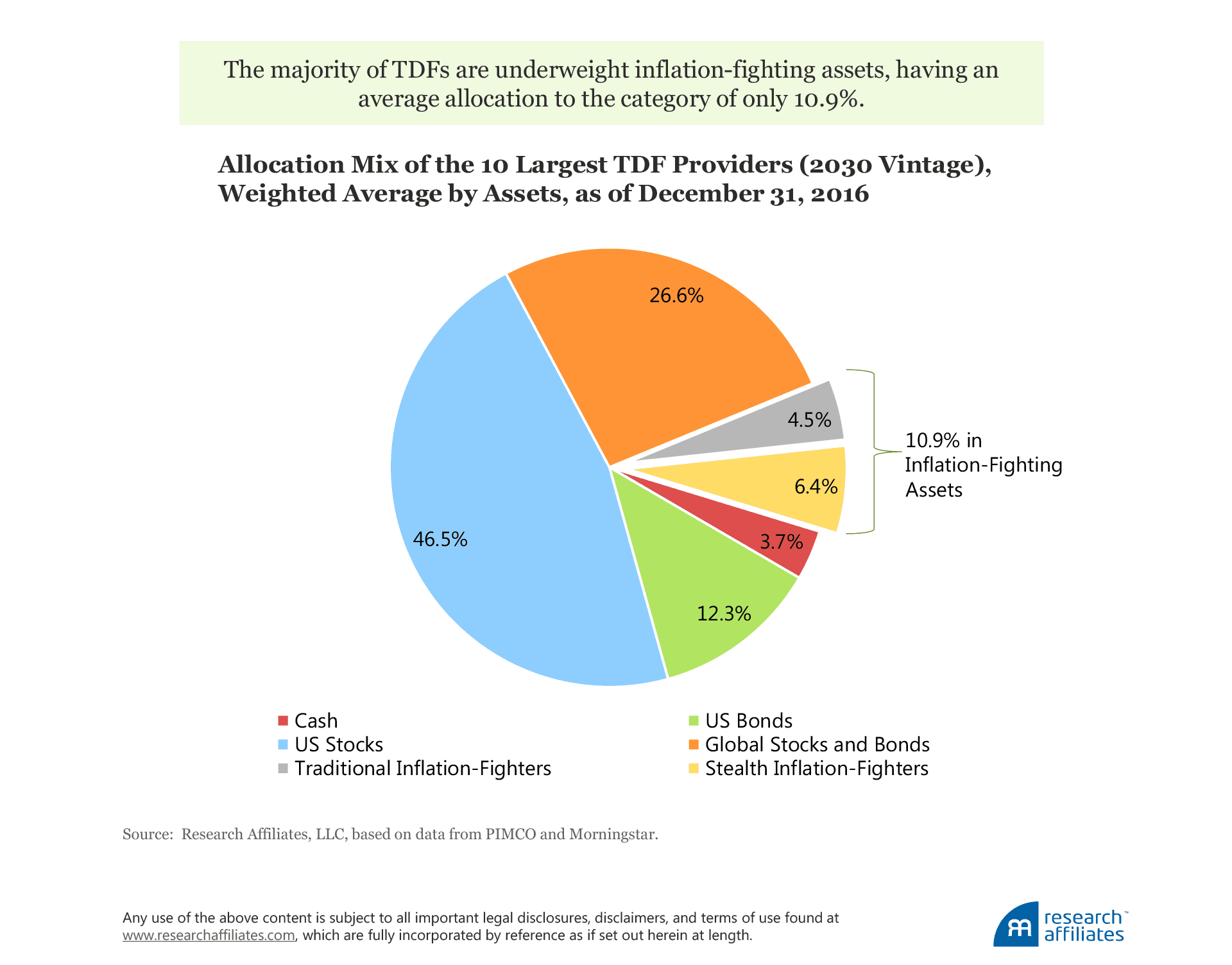 Asset classes other than real assets also provide inflation protection, even if they are not commonly viewed as inflation fighters. We at Research Affiliates refer to these asset classes as “stealth inflation fighters,” a category that includes high-yield bonds and bank loans, along with allocations away from the US dollar into emerging markets (EM) currencies, bonds, and equities. (After all, what is inflation, if it’s not US dollar debasement?) These asset classes have demonstrated positive correlation with US inflation, with many offering inflation protection superior to that provided by TIPS.8Across the 2030 TDF vintages offered by the 10 largest providers, these stealth inflation-fighters had an average allocation of 6.4% as of December 31, 2016. Adding this to the 4.5% allocation to real assets, the total allocation to inflation-fighting assets was only a modest 10.9%.