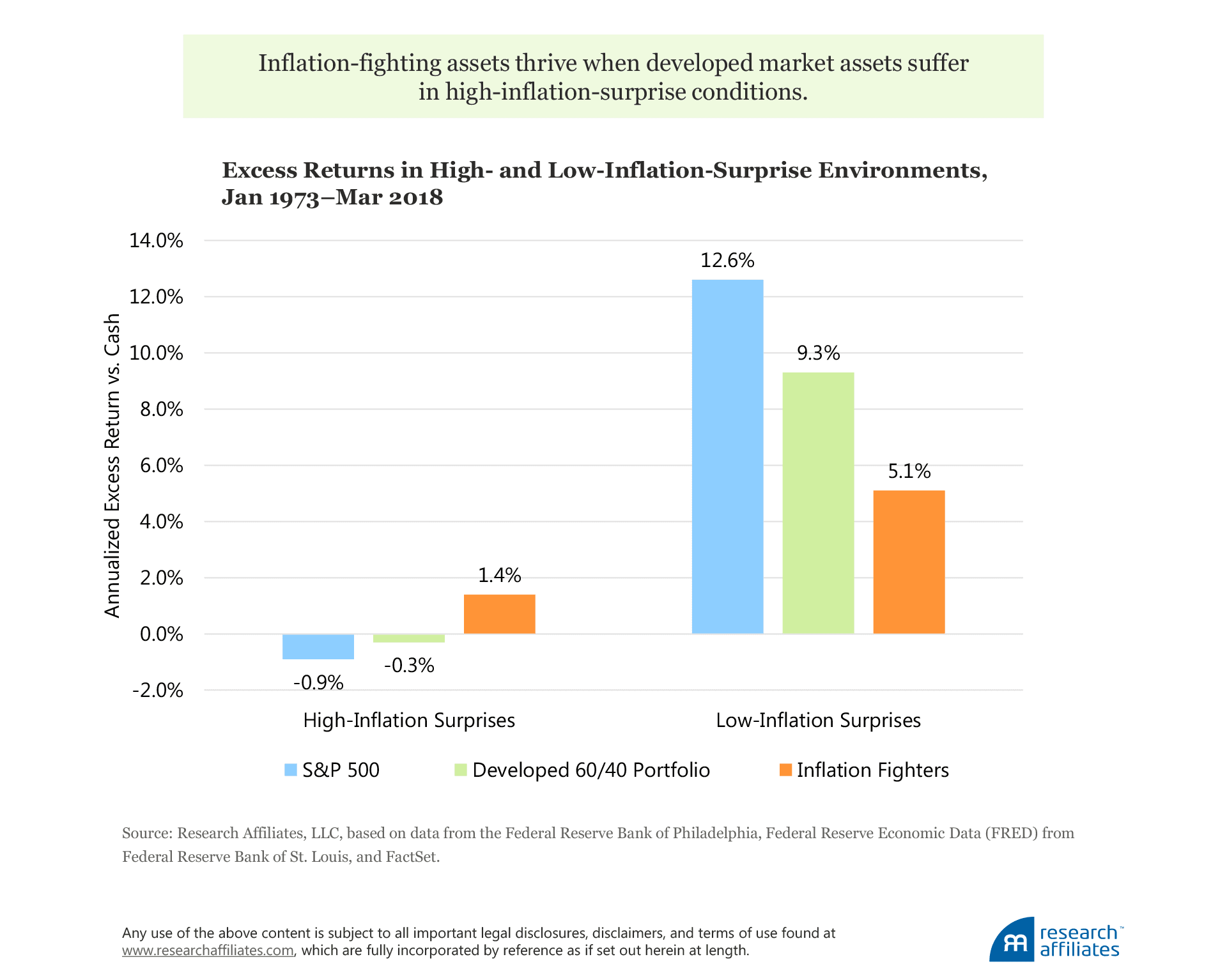 When inflation is lower than anticipated, developed-market stocks and bonds shine. For example, since 1973, in low-inflation-surprise environments, these assets delivered brilliant average annualized returns in excess of the cash return of 12.6% for US stocks and 9.3% for a developed 60/40 mix. An equally weighted basket of inflation-fighting assets13 lagged these conventional assets, but nevertheless delivered a reasonable positive average excess return of 5.1%.