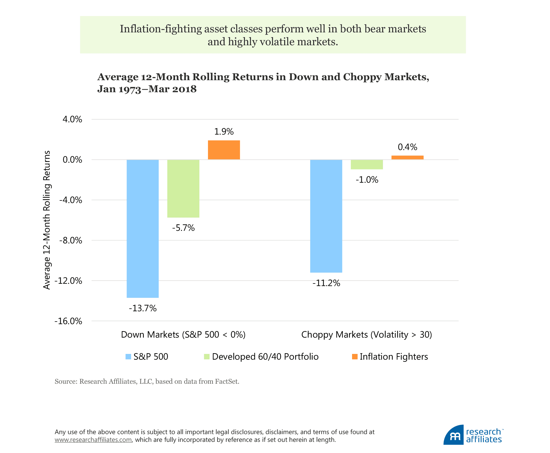 Inflation-fighting assets also provide powerful protection in other conditions of distress for developed-market stocks and bonds—both bear markets and volatile markets. Consider the times over the last 45 years when the S&P 500 Index delivered a negative 12-month rolling return. In these bear markets, mainstream assets gravely suffered, delivering an average rolling 12-month return of −13.7% for US stocks and −5.7% for a developed 60/40 portfolio. In stark contrast, under these same conditions, an equally weighted mix of real-return inflation-fighters provided significant downside protection, providing an average gain of 1.9%!
