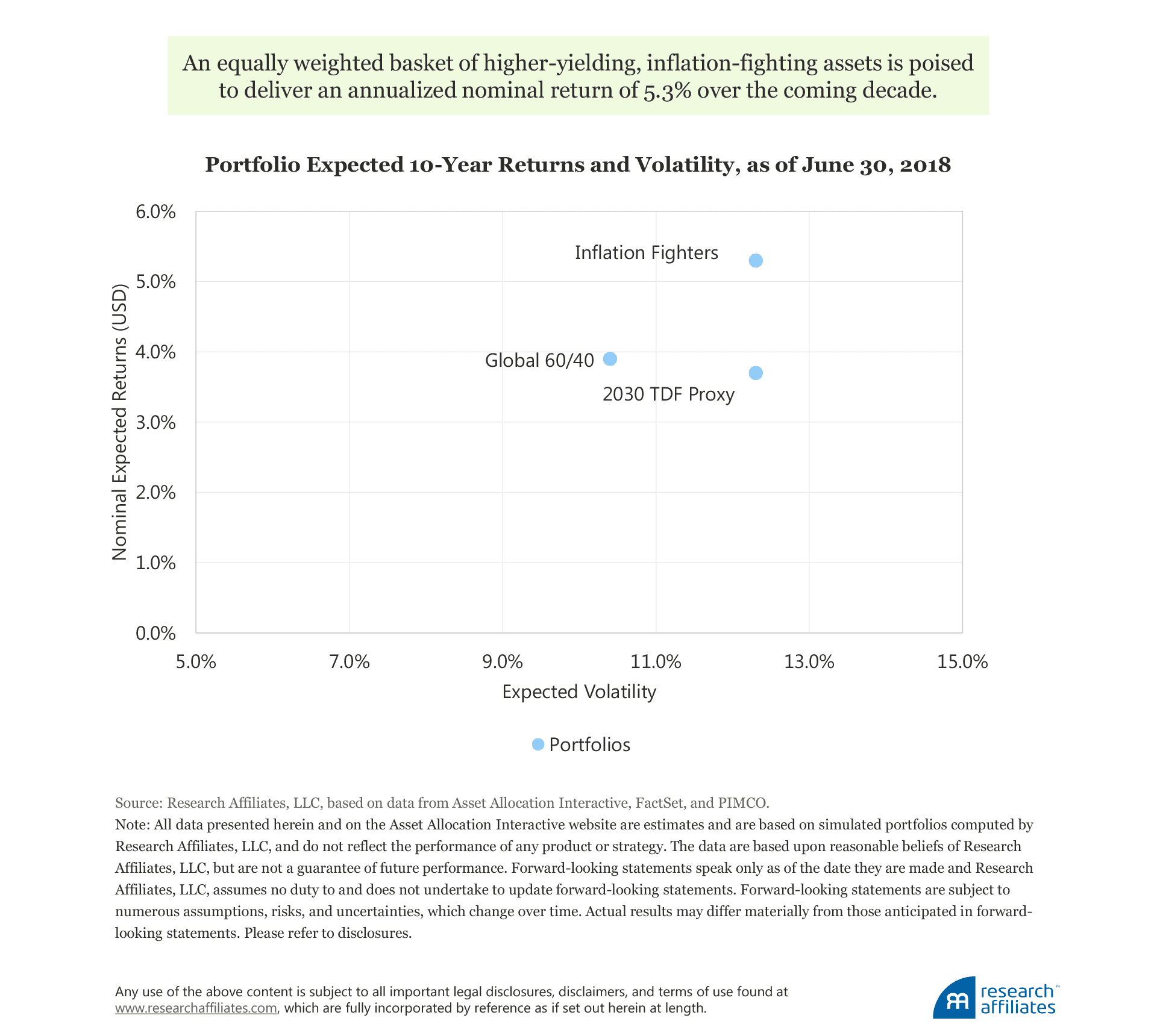 Additionally, we believe the long-term return prospects of inflation-fighting, real-return-producing assets are currently attractive relative to the investment opportunity set. Based on a building-block-return approach that focuses on expected yield, growth in yield, and future changes in asset and currency valuations, the Research Affiliates Asset Allocation Interactive (AAI) tool, which is available on our website, provides 10-year return estimates for asset classes and portfolios. Even after a rebound in many inflation-fighting markets since the 2013–2015 bear market, an equally weighted basket of these higher-yielding assets is poised to deliver an annualized nominal return of 5.3% over the coming decade.