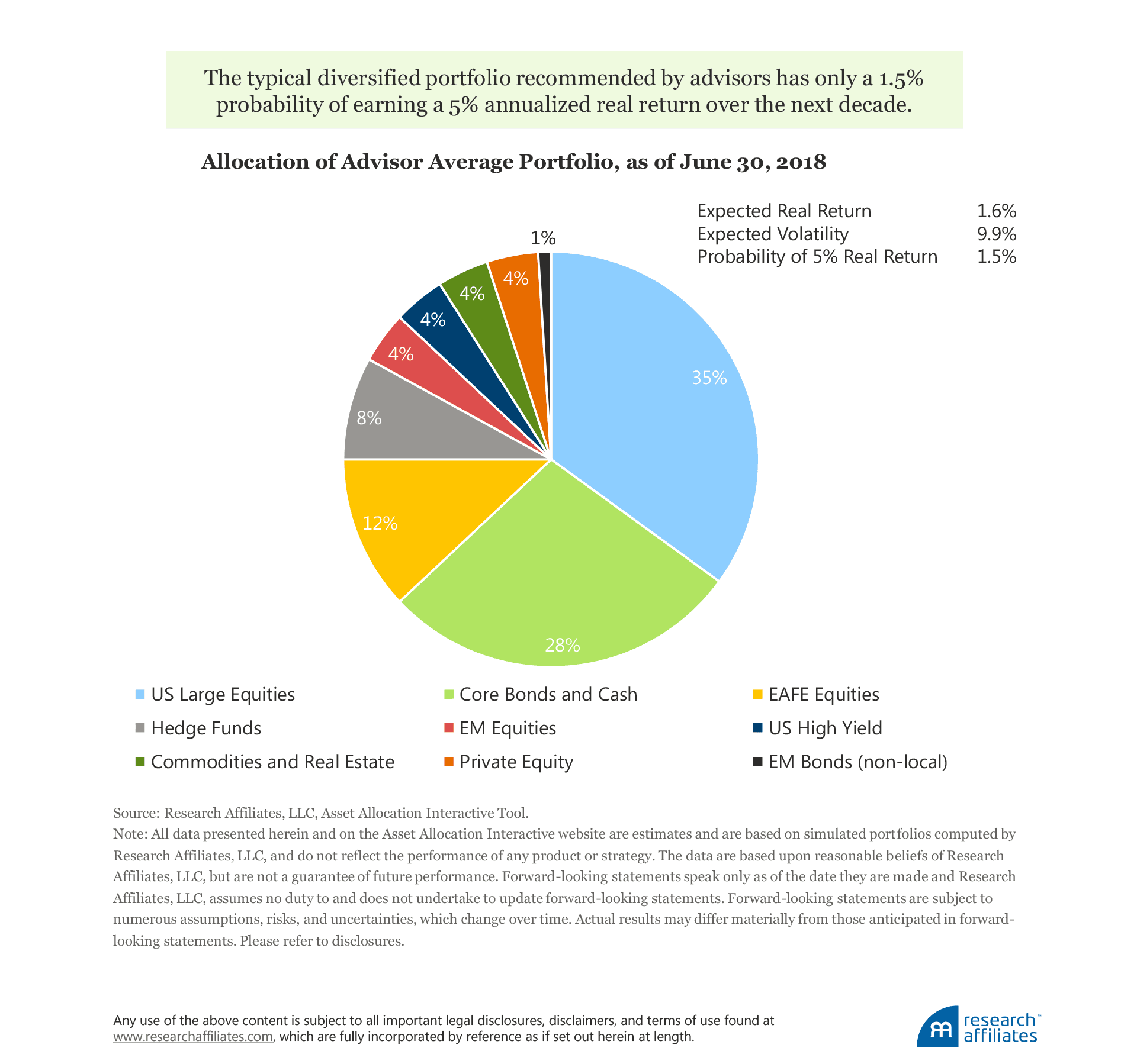 Most investors seek to earn a 5% annualized return above inflation to securely meet their financial needs in retirement. With today’s low expected returns across financial markets, most mainstream portfolios, including the typical advisor portfolio, are poised to fall well short of this mark.