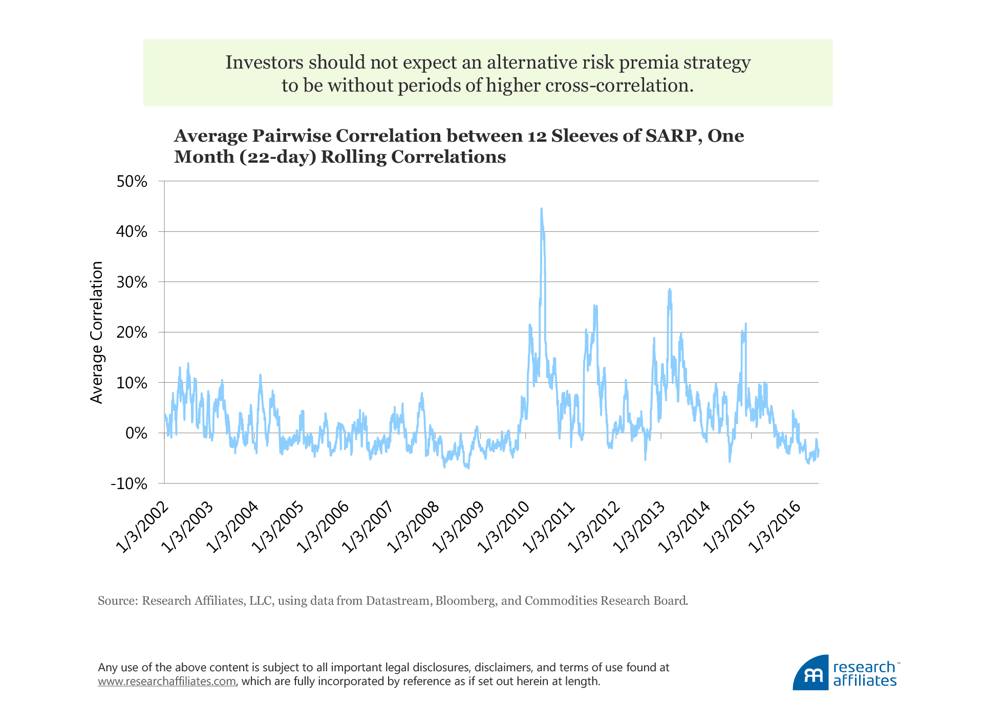 Generally, the initial benefit of combining factors in an alternative risk premia strategy shows up as volatility reduction.6 Thus, the correlations of the component factors must maintain their diversifying properties in order for the strategy to deliver on its promise. We analyze the correlation levels of all combinations across three factors—carry, value, and momentum—across four markets—bonds, currencies, equities, and commodities—from February 1989 through December 2017. The average pairwise correlation of these 12 sleeves is 0.03, which means they are essentially uncorrelated. Furthermore, the time variation of these average pairwise correlations has typically been quite low, even over short horizons, with rolling one month (22-day) correlations wavering between −10% and +10%, although we have observed several meaningful rises in these correlations over the last 10 years. These short-lived periods of spikes in correlation are a warning sign of the danger of the risk and leverage in these strategies and a reminder that they need to be assumed with a degree of humility, not with blind adherence to the historical data and the output of overly calibrated models.