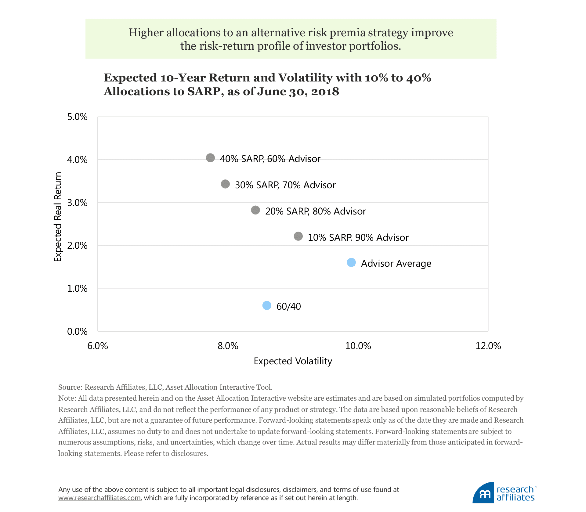 Steadily increasing exposure to the SARP approach within the Advisor Average portfolio leads to rising expected returns and falling portfolio-level volatility. An Advisor Average portfolio with a 20% allocation to the SARP strategy improves its 10-year real return prospect to 2.8% from the currently estimated 1.6%, while creating a volatility profile approximately 15% lower than that of the Average Advisor portfolio (8.4% vs. 9.9%). This benefit translates into a dramatic improvement in the potential risk-adjusted return, represented by an expected Sharpe ratio of 0.33, exceeding the Sharpe ratio of the Advisor Average portfolio by 1.1x and of a US 60/40 portfolio by 3.8x.