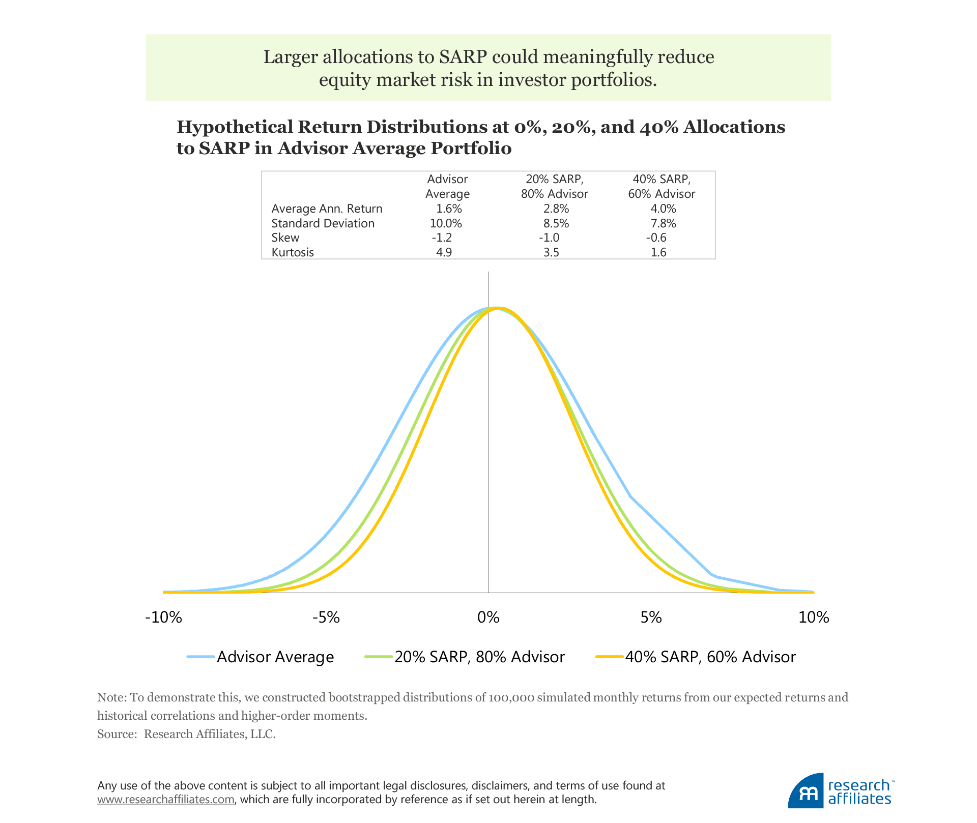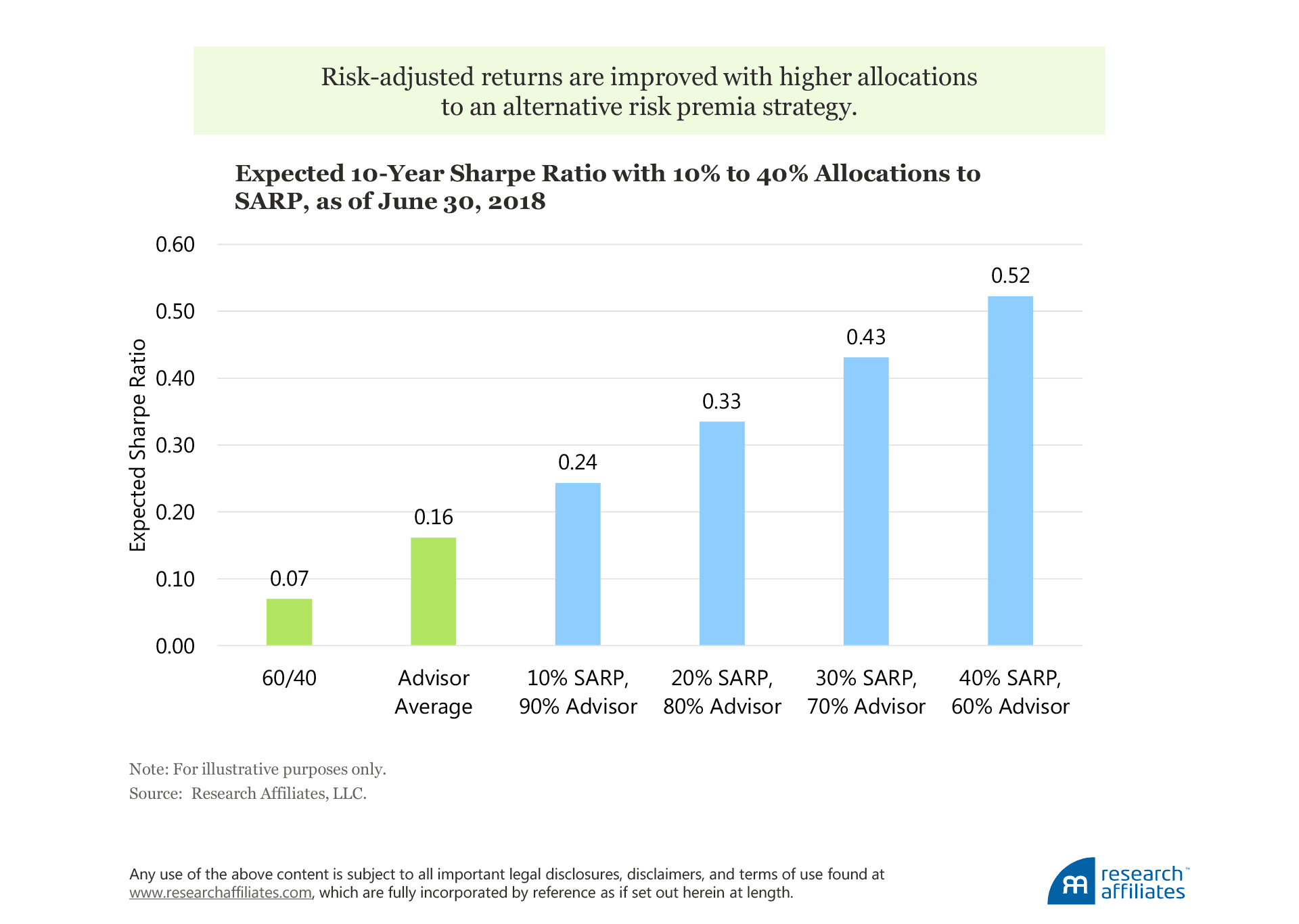 A portfolio with a 10% allocation to SARP is poised to produce a Sharpe ratio marginally higher than that of the Advisor Average portfolio (0.24 vs. 0.16, respectively). Does this suggest that advisors need to introduce an allocation greater than 10% to make the switch worthwhile or that advisors are already capturing a large portion of the benefits associated with these strategies? A careful look produces a definitive “No.”