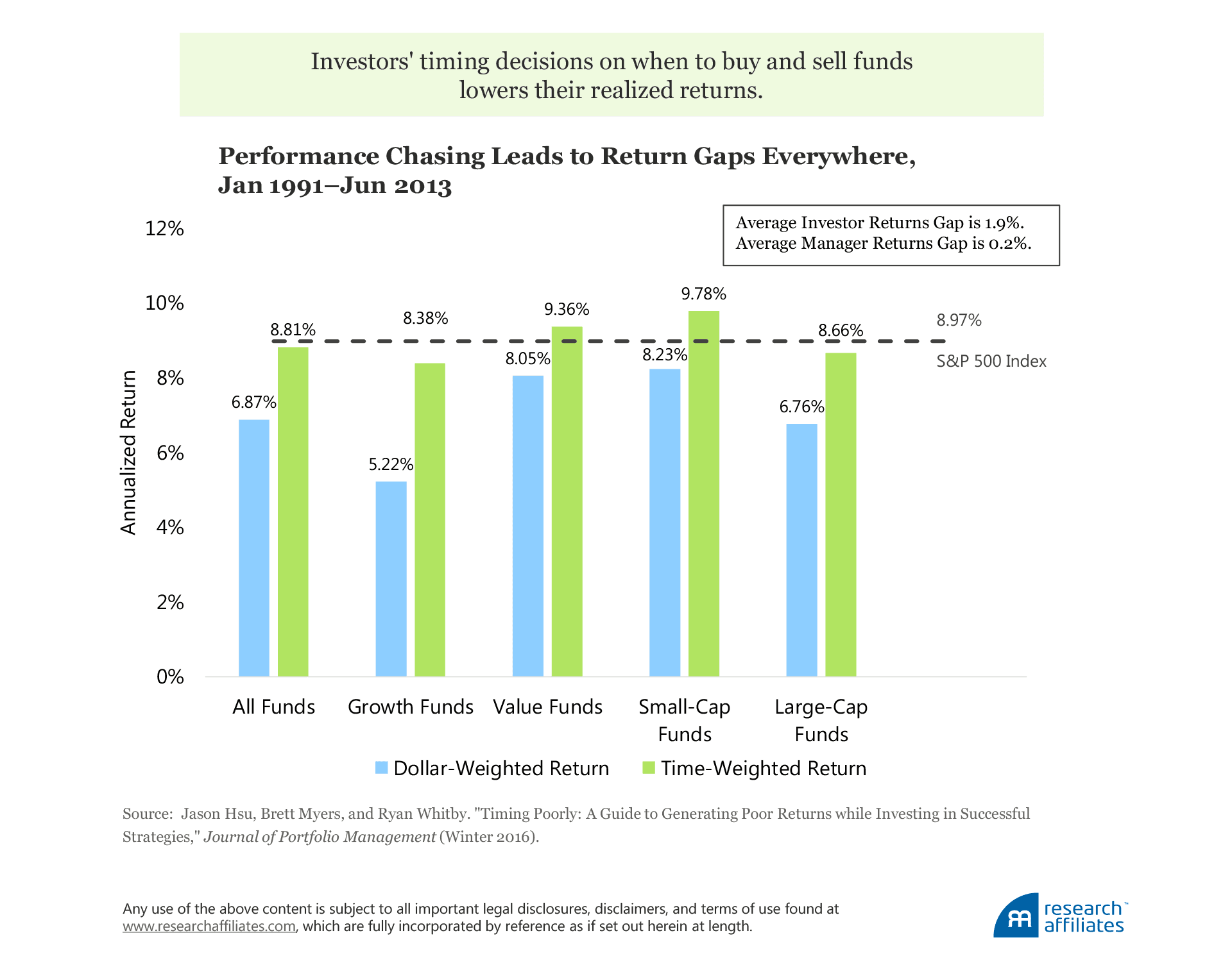 Interestingly enough, the negative investor returns gap isn’t limited to mutual funds whose investors are largely retail and potentially less financially sophisticated. We see the same patterns when we examine institutional funds, whose investors usually have substantial net worth and are typically assisted by investment professionals. Cornell, Hsu, and Nanigian (2017), studying 25 years of institutional mutual fund flows following a standard manager selection method of redeploying assets from underperforming to outperforming managers over a three-year evaluation period, found that funds attracting flows generally underperformed funds bleeding flows by 2.3% a year. Goyal and Wahal (2008), after analyzing 3,400 pension plan sponsors and their hiring and firing decisions, found that terminated managers outperformed newly hired managers over the subsequent three years by a cumulative 1.42%. Even though the pension plans were often advised by large and well-resourced global investment consultants, their firing and hiring decisions were nevertheless dominated by recent two- to three-year performance. Returns chasing into recently successful managers appears to be a primary cause of poor investment timing decisions and the resulting investor returns gap for retail and institutional investors alike.