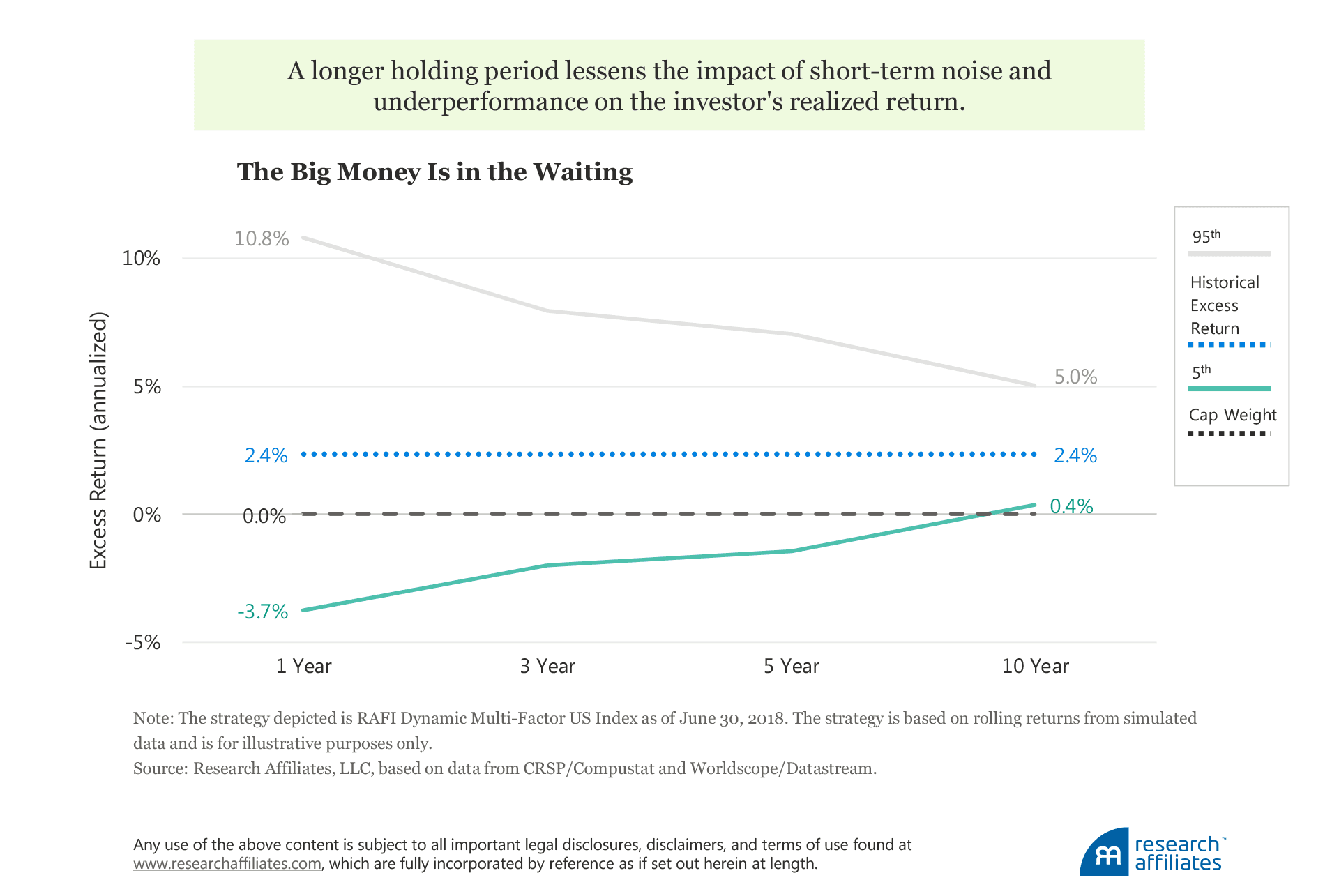A focus on how the return range narrows with longer horizons can encourage two mindsets, both equally important for better dollar-weighted returns. First, asset managers can communicate the rather wide range of results, which will inevitably have periods (sometimes sustained) of well-below benchmark performance. All performance over the short term will be noisy relative to the long-term expectations of the smart beta strategy. Second, asset managers can help clients appreciate that by extending their holding period, the impact of underperformance on their overall return will be lessened, thereby establishing a mindset of long-termism rather than short-termism. As Charlie Munger said, “The big money is not in the buying and selling … but in the waiting.”