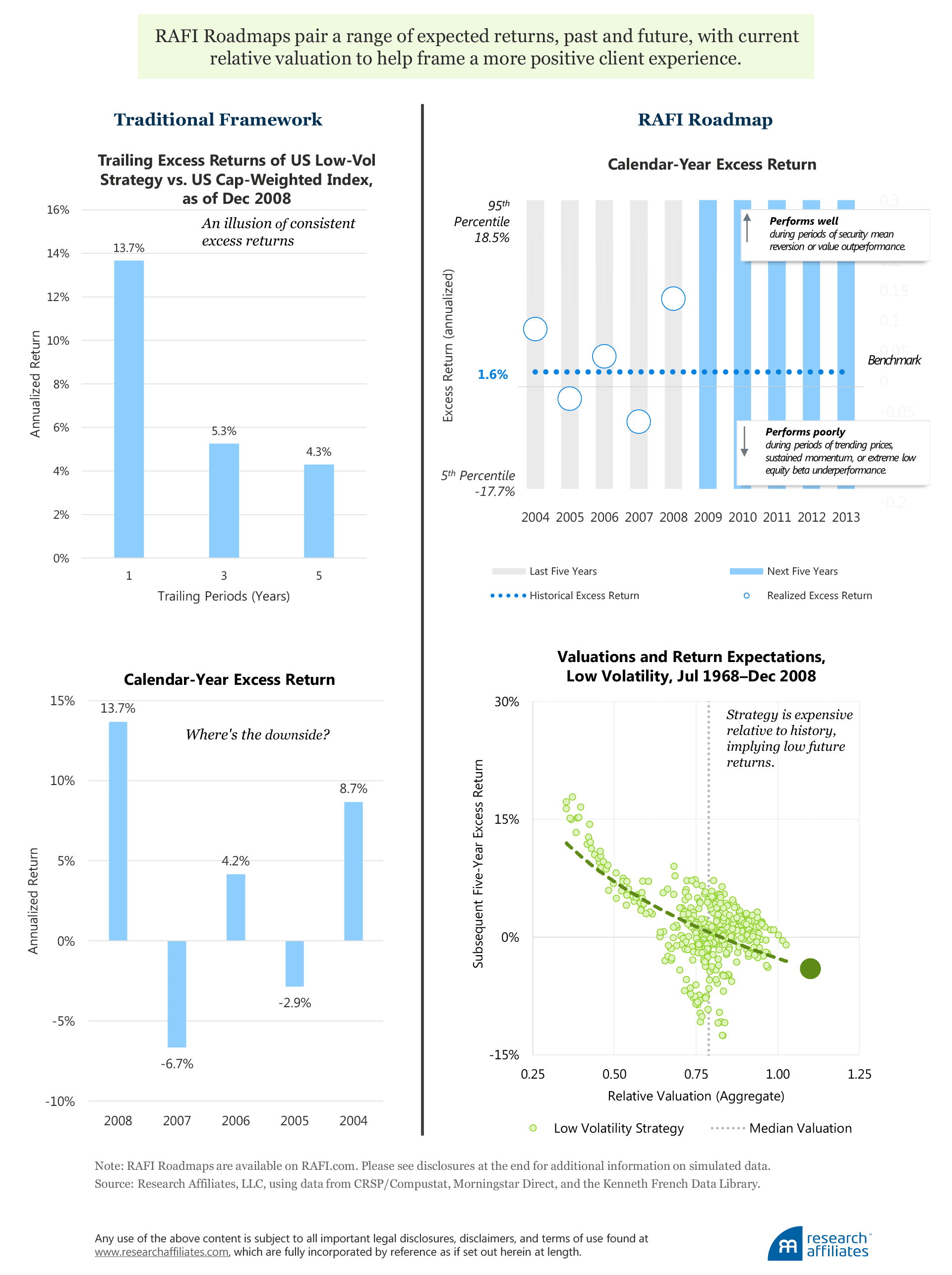 These two comparisons—a range of returns and relative valuations—are embedded in the RAFI™ Roadmap performance reviews on RAFI.com. Let’s compare them to the performance tables (cumulative annualized returns and annual year-by-year returns) that are a hallmark of a typical client-service review. Rewind the clock to the end of 2008. At the depths of the global financial crisis, a representative low-volatility strategy basked in wonderful historical relative performance.6 At a standard client review, investors would have been shown trailing three- and five-year excessreturns of between 4.0% and 5.5% a year, respectively, over a cap-weighted benchmark. These excess returns were largely due to an outstanding, and utterly unsurprising—given the lower equity beta in a year when the S&P 500 lost 37%—one-year trailing excess return of 13.7%. These results created an illusion the strategy would continue to generate a consistent excess return going forward. A calendar-year review of the last five years only partially offsets this illusion. Yes, the strategy does have individual years of negative excess returns in 2005 and 2007, but they are relatively modest compared to the massive upside experienced in the 2008 bear market.