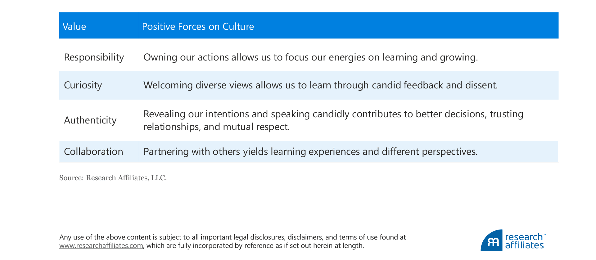 1. We recognize that the word “right” is ambiguous and can have a negative interpretation; in this case, we mean people who enthusiastically embrace the Research Affiliates mission and culture.