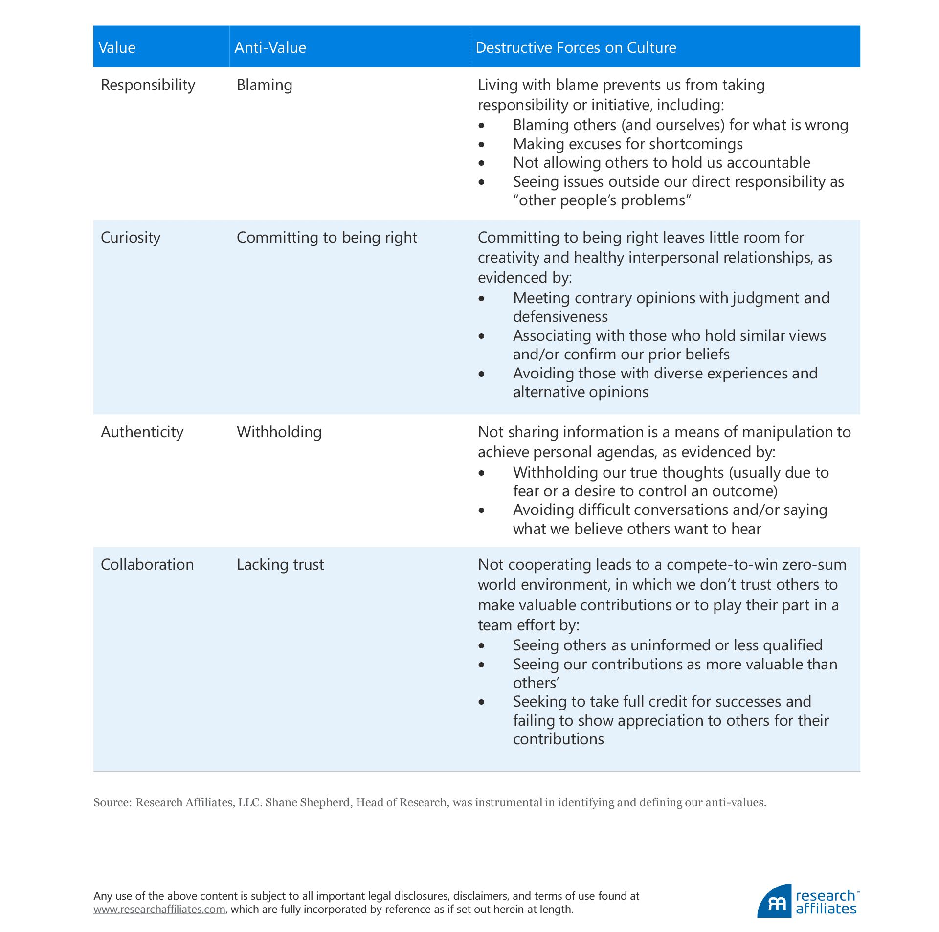 We build our culture around the aspirational values of responsibility, curiosity, authenticity, and collaboration rather than the potentially destructive anti-values of blaming, committing to being right, withholding information, and lacking trust in others.