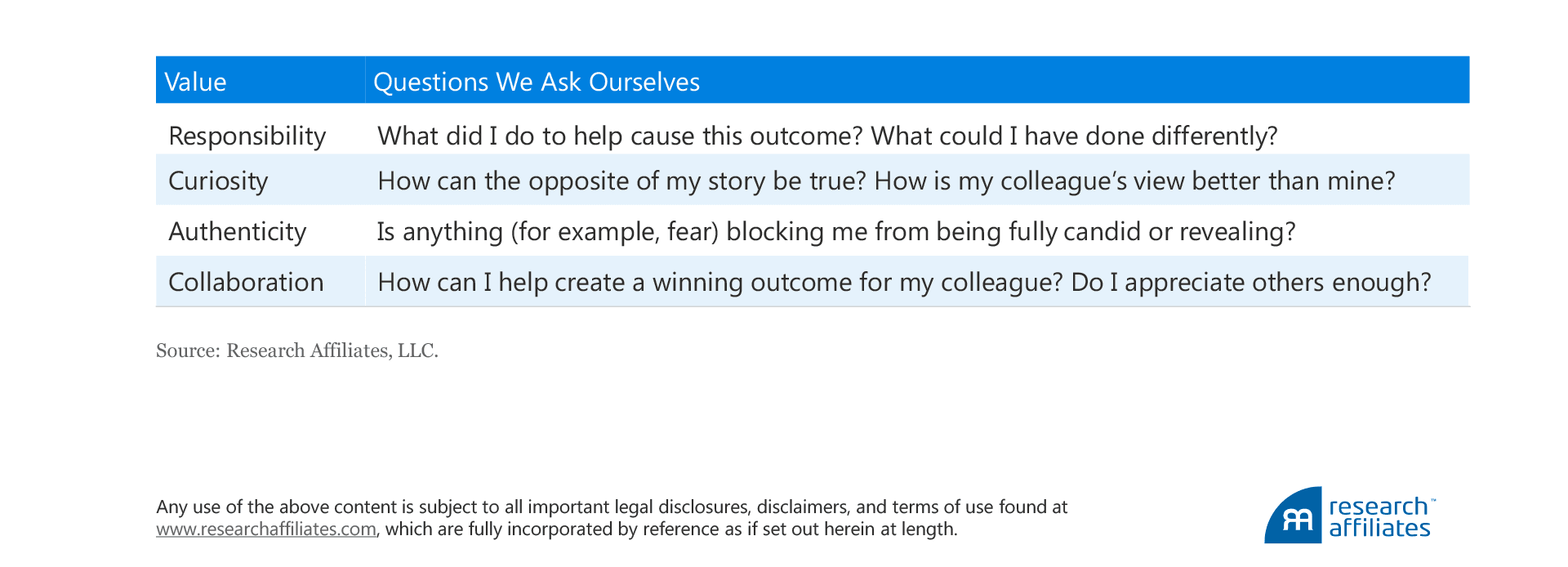 Our recent CEO transition has provided an opportunity for us to reflect on what makes Research Affiliates successful. The winning formula for Research Affiliates is a team of skilled and competent people, each of whom embodies the values of our culture, working together in a curious and collaborative approach to achieve our firm mission. We believe that when our team is aligned by an inspirational mission and thrives in an inclusive culture, which deliberately strives to improve the firm’s level of collective intelligence, we are well positioned to achieve win-win-win outcomes—that is, a win for our end investors, a win for our distribution partners, and a win for ourselves.