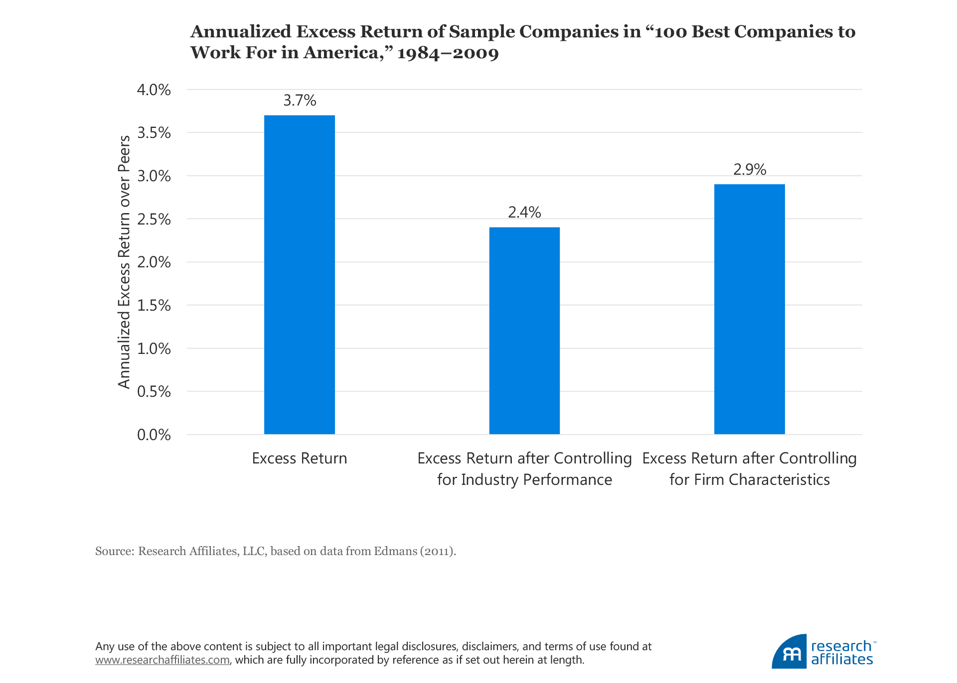 Does our view seem overly idealistic? Perhaps, but it is increasingly supported by research showing a positive relationship between an organization’s culture and long-run firm value. Measuring job satisfaction using Fortune magazine’s “100 Best Companies to Work For in America” and controlling for other effects, Edmans (2011) found that firms whose employees have high levels of job satisfaction also tend to deliver high long-term stock returns. The companies listed in the “100 Best Companies” list beat their peers by 2.4% to 3.7% a year over the 26-year span ending 2009.