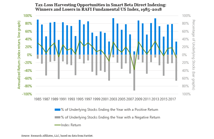 Like cap-weighted portfolios, smart beta indices generally have large breadth in their securities positions on which to apply these tax management techniques. For instance, the RAFI Fundamental US Index held 478 securities as of December 31, 2018. The RAFI-based single-factor index portfolios, such as RAFI Value Factor, Quality Factor, and Low Volatility Factor, typically hold over 100 securities each. Thus, even in calendar years when these indices post positive returns, some securities in each index should have a negative return that dips below cost basis and could be used in loss harvesting.
