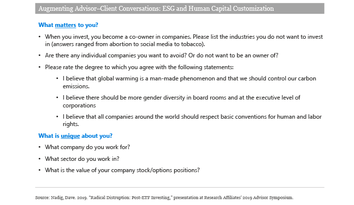 Because of the close advisor-client relationship, advisors understand the issues important to their clients and can customize an equity portfolio that appropriately reflects their clients’ preferences. In his presentation at the 2019 Research Affiliates Advisor Symposium, Dave Nadig suggested an augmented client questionnaire that moves beyond the basics of age, income, assets, and risk tolerance. The themes he included nicely align with our observations around ESG and human capital customization. Advisors who guide clients using the types of questions Dave Nadig suggests can deliver a rich client experience, and the resulting portfolio may then align more closely with the client’s personal beliefs and circumstances.