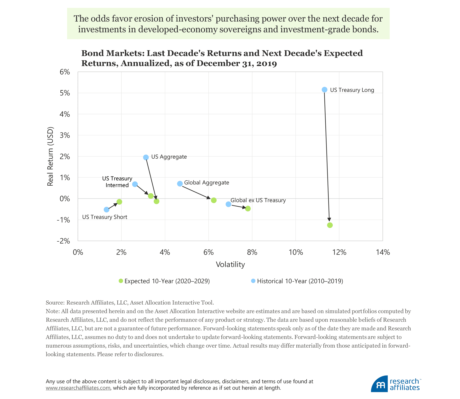 Referring to the historical 2019 returns on AAI, we can see that core bonds had a very good year indeed. While US and Global Aggregate indices earned very generous returns of 6.2% and 4.4%, respectively, net of inflation, the long end of the US Treasury market outpaced all expectations, returning 12.2% net of inflation through December 31, 2019. While bond investors may naturally wish for more of the same in the months and years ahead, the forward-looking 10-year picture is less promising.