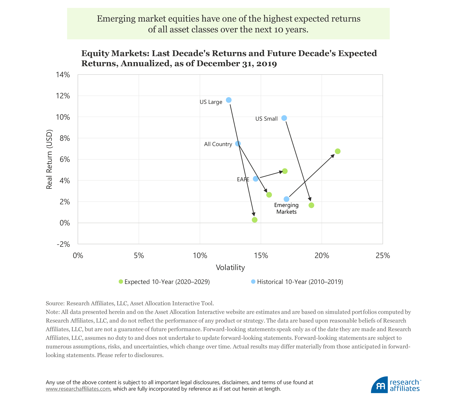 The price of an asset matters: richly priced assets tend to deliver underwhelming returns, while relatively inexpensive assets are better positioned to deliver healthy returns over the medium to long term. Over the next decade, based on our empirically informed understanding of capital markets, we expect emerging market equities to outperform developed market equities and to outperform US equities in particular. Our forecast is that US large equities should do marginally better than inflation at a 0.3% annualized real return and that emerging market equities should deliver a 6.8% real return a year over the next decade. In the middle of this range of expectations, our models tell us that EAFE equities are expected to return a still-robust 4.9% a year in real terms.